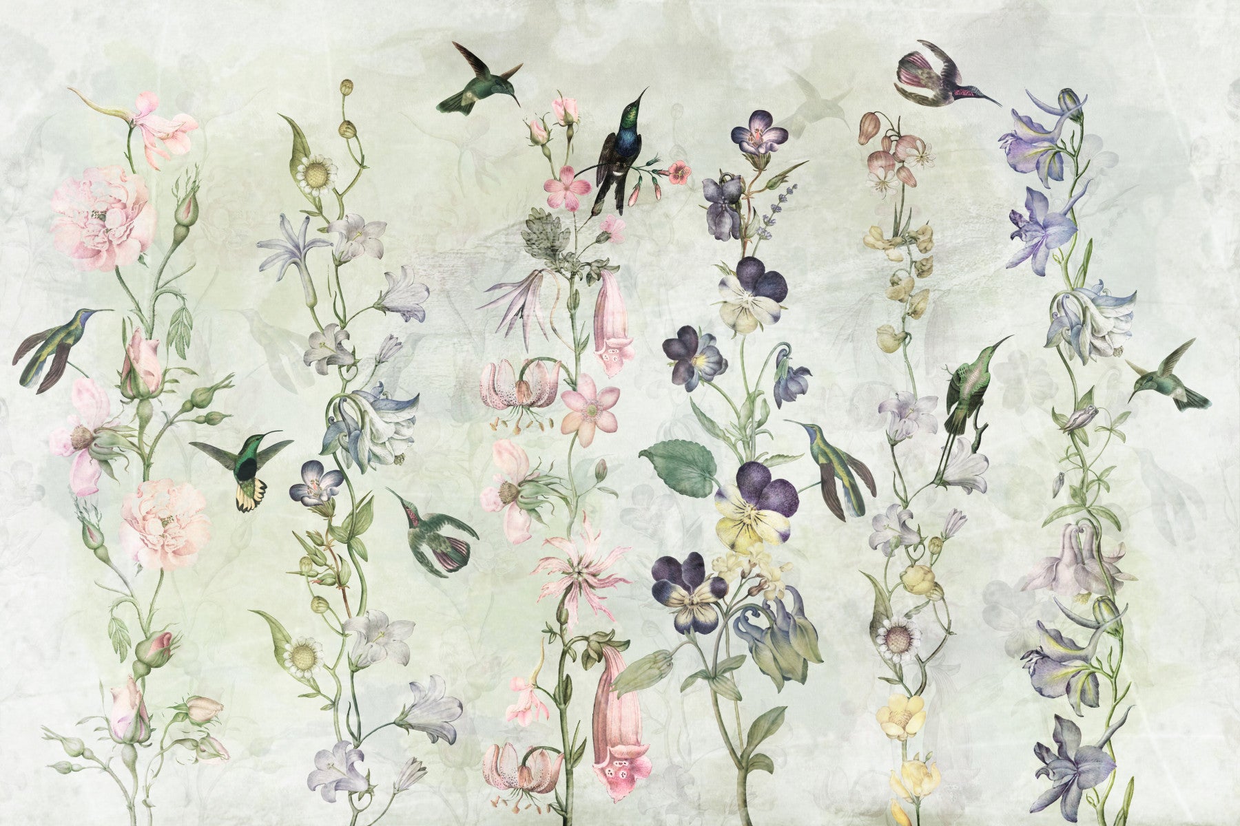 Escape to a tranquil garden with this stunning wallpaper. Featuring a delicate watercolor-style design of pastel flowers and hummingbirds, it creates a peaceful atmosphere in any space. The soft color palette, including shades of pink, purple, and green, evokes a sense of calm and serenity. The intricate details of the flowers and birds add a touch of elegance and sophistication, while the seamless pattern ensures a cohesive and visually pleasing effect. Perfect for bedrooms, living rooms, or any space needing a touch of nature-inspired beauty.