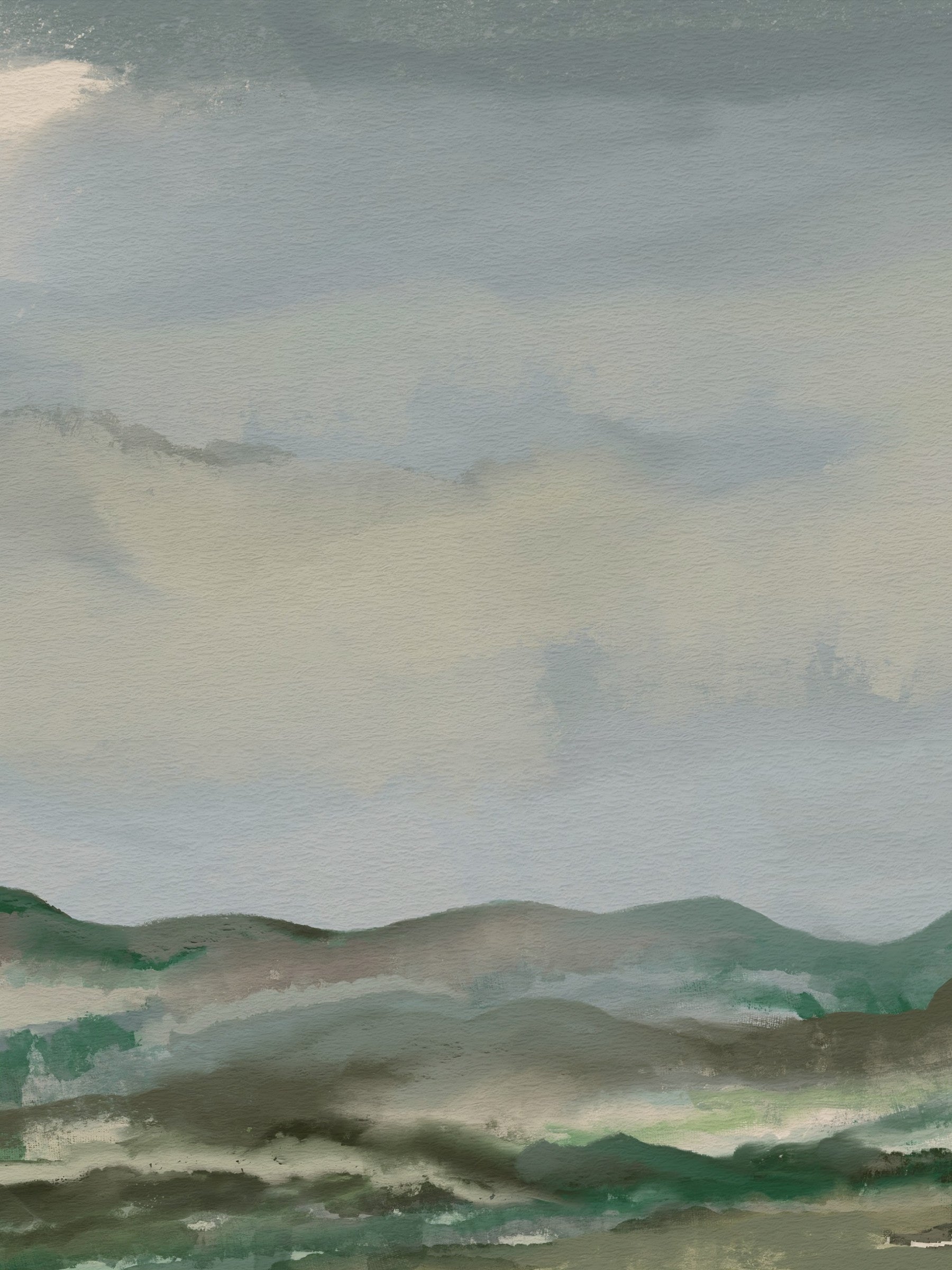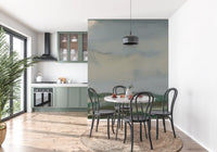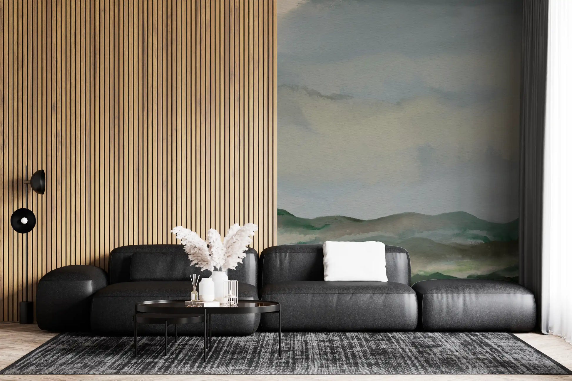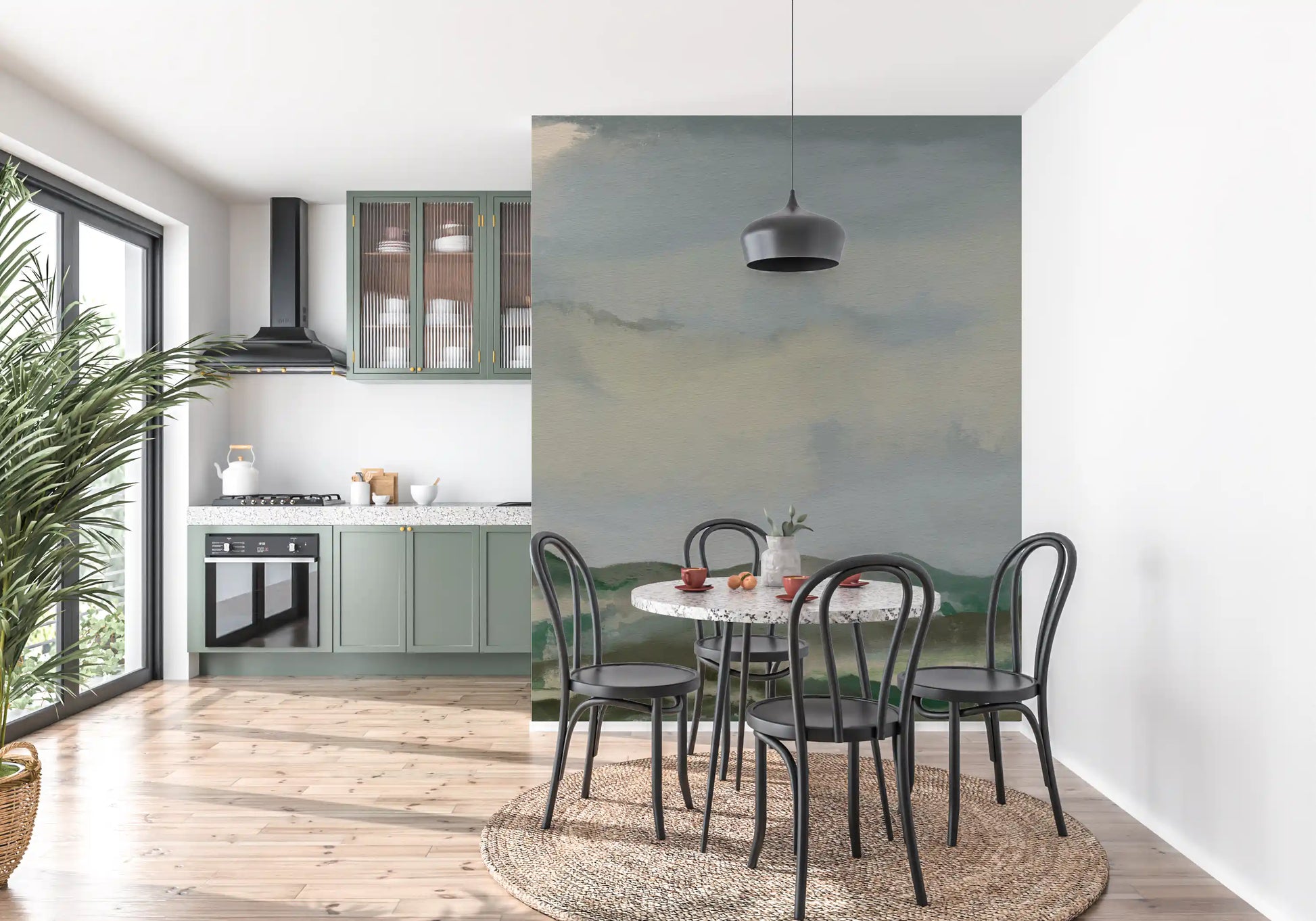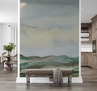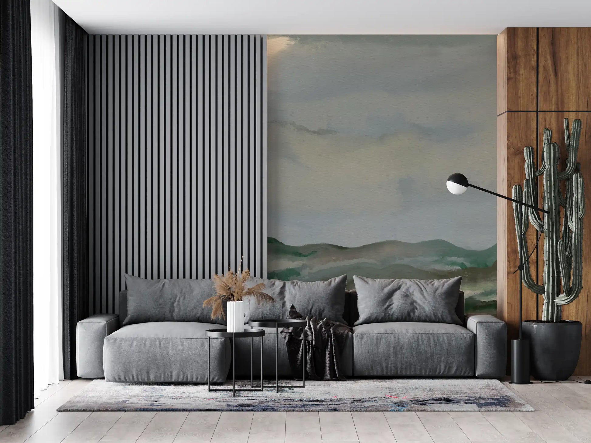 This exquisite wallpaper for walls transforms your room into a tranquil vista. Its painterly style features broad, soft brushstrokes, creating an ethereal landscape of rolling hills and a serene sky. A soothing colour palette blends muted greens, earthy greys, and gentle beige, evoking a misty morning atmosphere. This design brings calm and depth to any interior. Install it in your living room, bedroom, or home office to cultivate a peaceful retreat. The artistic composition adds natural beauty and a sophisticated, inviting ambience. It complements minimalist or Scandinavian decor beautifully, making your space feel expansive and harmonious.