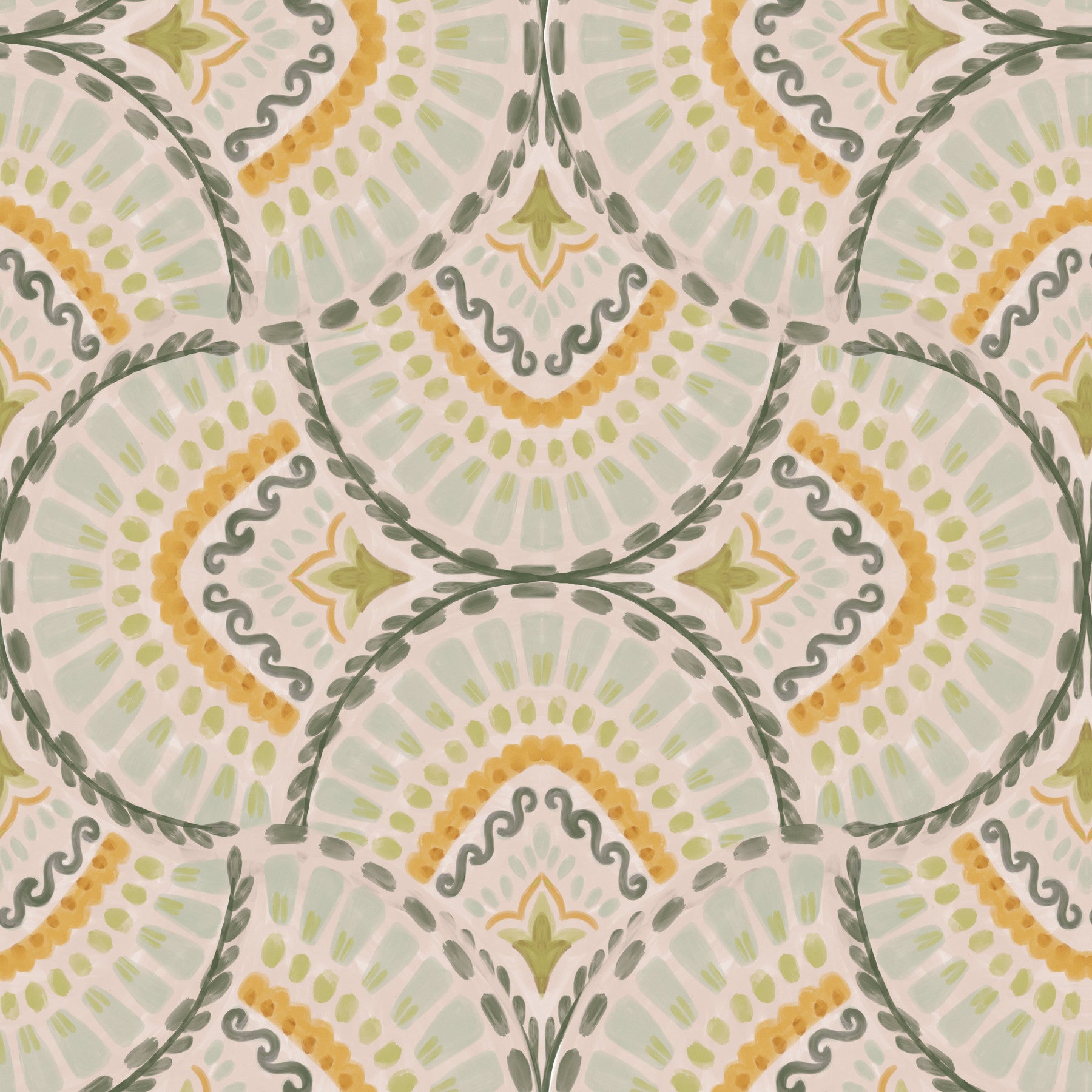 This wallpaper design evokes a sense of calm and tranquility with its soft, muted palette of sage greens, pale yellows, and blush pinks. The intricate mandala-inspired pattern creates a visually appealing tapestry of organic shapes and flowing lines, reminiscent of hand-painted artwork. The subtle color variations and gentle brushstrokes add depth and texture, making it perfect for creating a soothing and peaceful atmosphere in any room. The design's delicate yet complex nature offers a sophisticated touch, suitable for bedrooms, living rooms, or even home offices seeking a calming and restorative ambiance.