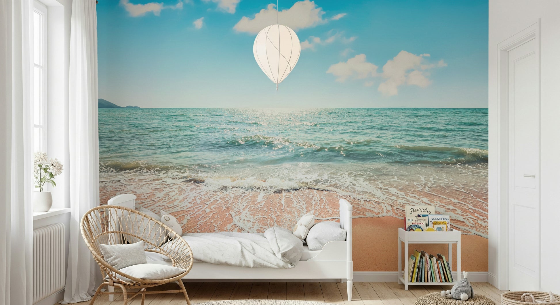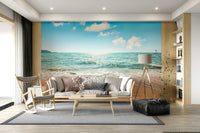 Transform your space into a tranquil coastal escape with this captivating image. The gentle, turquoise water meets the sandy shore under a bright, cloud-dotted sky. This wallpaper for walls design brings the calming essence of the beach to any room. The light, airy colour palette makes it perfect for bedrooms, bathrooms, or even a home office, infusing spaces with peace and openness. The natural simplicity and light make it work well in rooms with minimalist or Scandinavian designs.