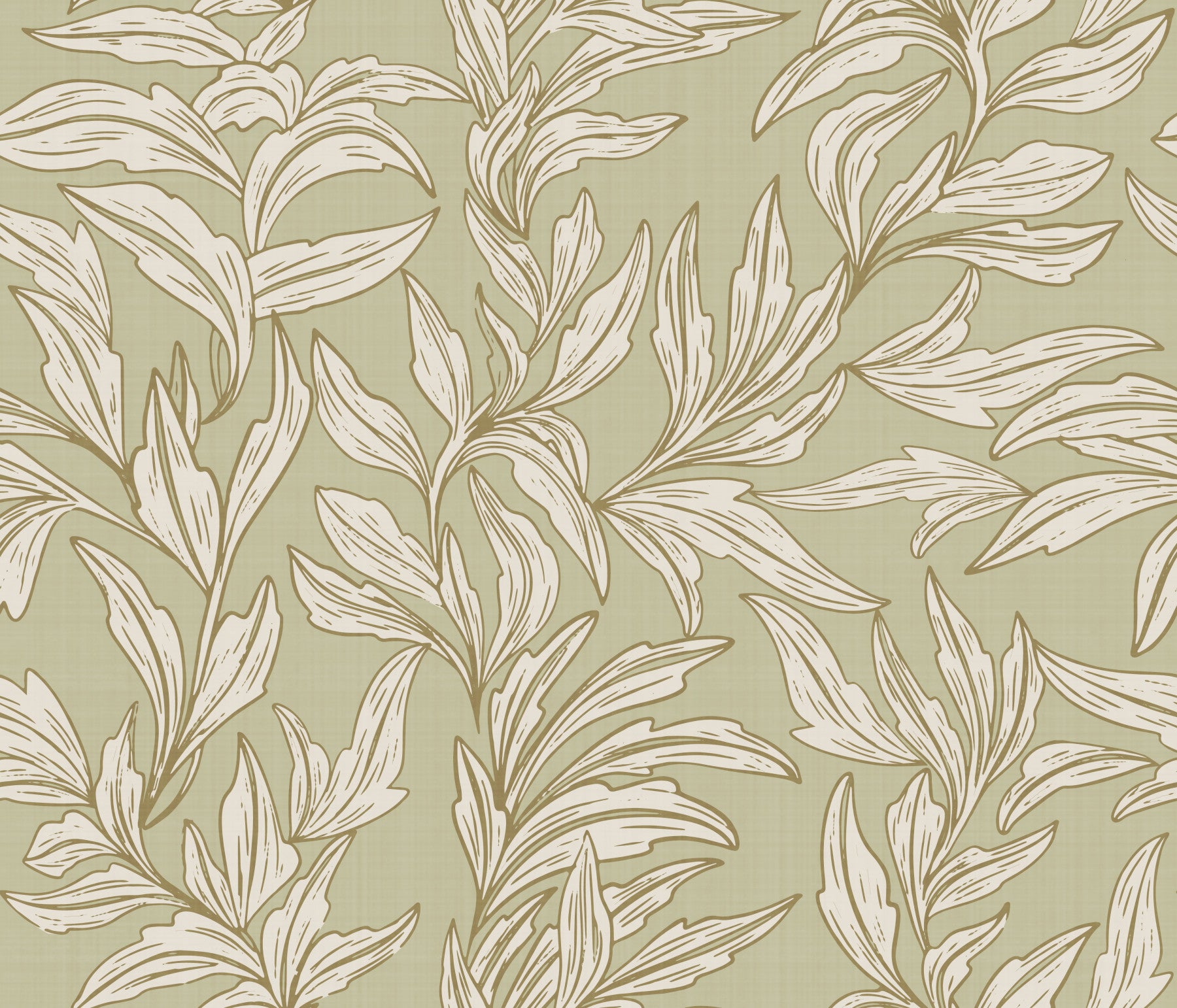 This wallpaper design evokes a sense of calm and tranquility with its intricate botanical pattern. The delicate, hand-drawn style of the off-white leaves against a muted sage green background creates a sophisticated and understated aesthetic. The seamless pattern is perfect for adding a touch of elegance to any room, from bedrooms to living rooms, bringing a peaceful and natural ambiance to your space. Its muted tones create a versatile backdrop that complements various interior styles, from modern minimalism to classic elegance. The detailed leaf illustrations offer a visual richness without being overpowering, making it an ideal choice for a serene and restful atmosphere.