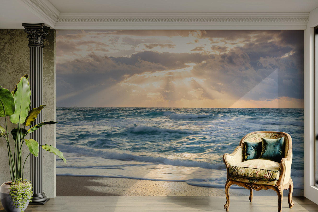 Experience the calming allure of the coast with our serene seashore serenade mural. This exquisite beach wallpaper captures the serene beauty of a sunlit shore, with waves gently caressing the sandy beach. It is the perfect choice for anyone looking to create a peaceful and inviting atmosphere in their home or workplace. The mural showcases high-quality imagery that brings the tranquility of the ocean directly to your room. It's ideal for instilling a sense of calm and relaxation, allowing you to escape to the seaside whenever you wish. Made with durable materials, our beach wallpaper ensures a lasting scenic presence, enhancing the aesthetic of both modern and traditional decors.