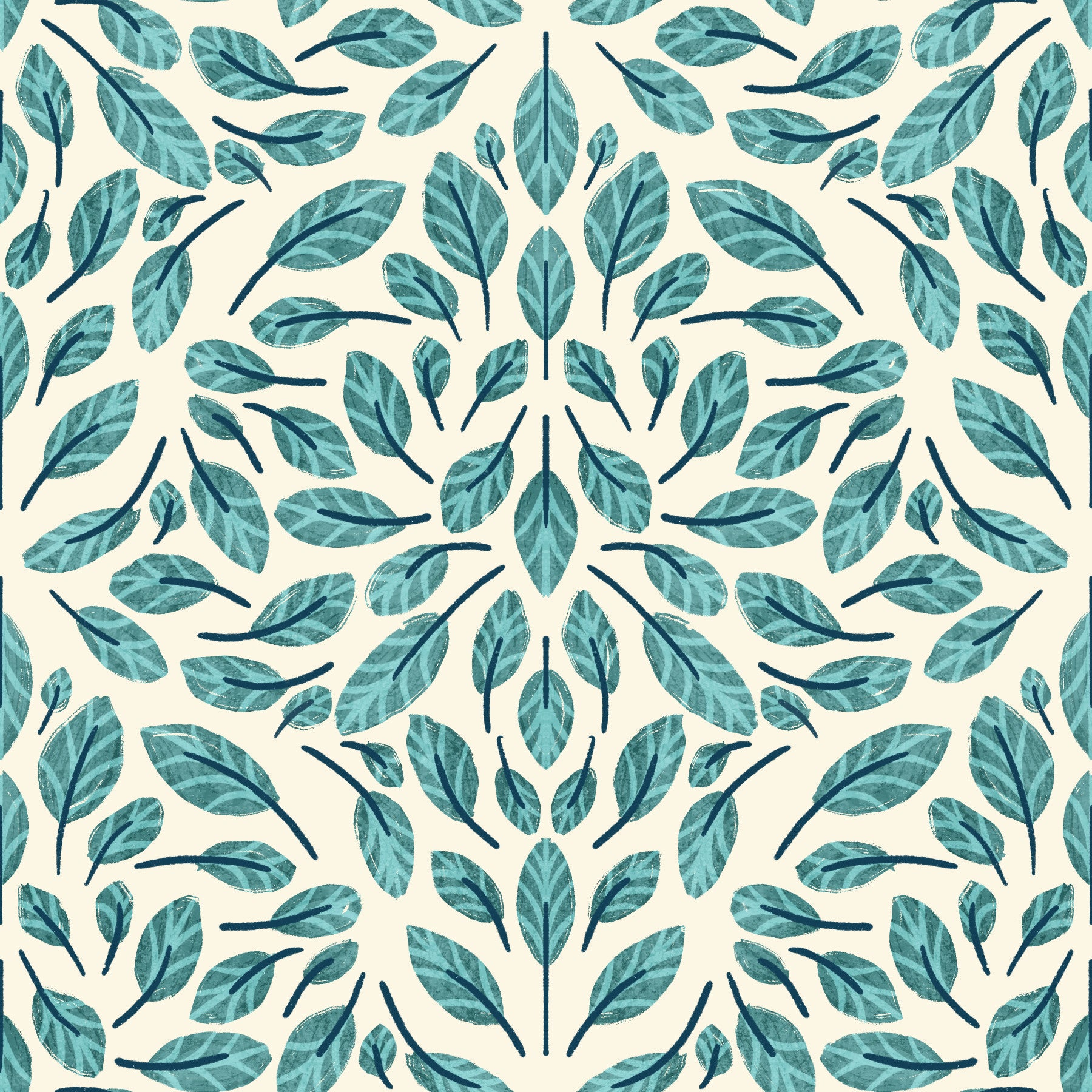 This wallpaper features a calming pattern of teal leaves on a creamy beige background. The leaves are hand-drawn with a textured, watercolor-like effect, creating a sense of organic, natural beauty. The repeating pattern is subtle yet visually engaging, offering a peaceful and sophisticated aesthetic suitable for any room in your home. Its muted color palette and gentle design promote relaxation and tranquility, making it a perfect choice for bedrooms, living rooms, or home offices. The organic shapes and calming teal hues create a serene atmosphere, perfect for unwinding after a long day. This pattern is a coordinate for the Enchanted Aviary Design.
