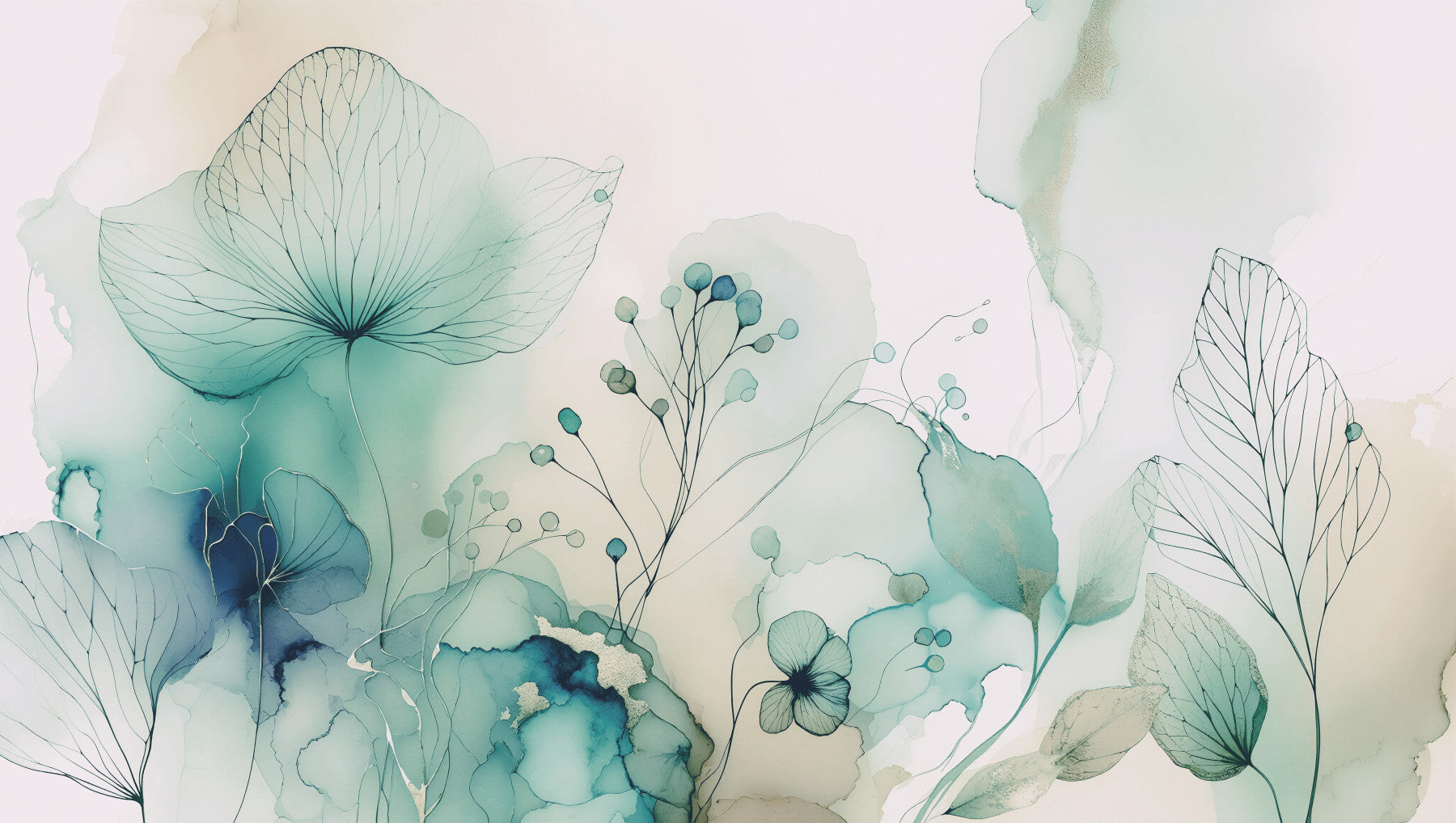 Immerse yourself in the tranquil beauty of Serenity Blossom Dream 2 a wallpaper that evokes a sense of peace and gentle wonder. This design features delicate floral and botanical illustrations rendered in ethereal watercolor washes of soft teal, blue, and hints of neutral beige. The artwork showcases translucent petals and intricate line work, creating a layered effect that feels both modern and timeless. Subtle metallic accents catch the light, adding a touch of understated elegance. The overall effect is calming and dreamlike, perfect for creating a serene and uplifting atmosphere on any device. Let this dreamy botanical landscape transform your screen into a personal oasis.