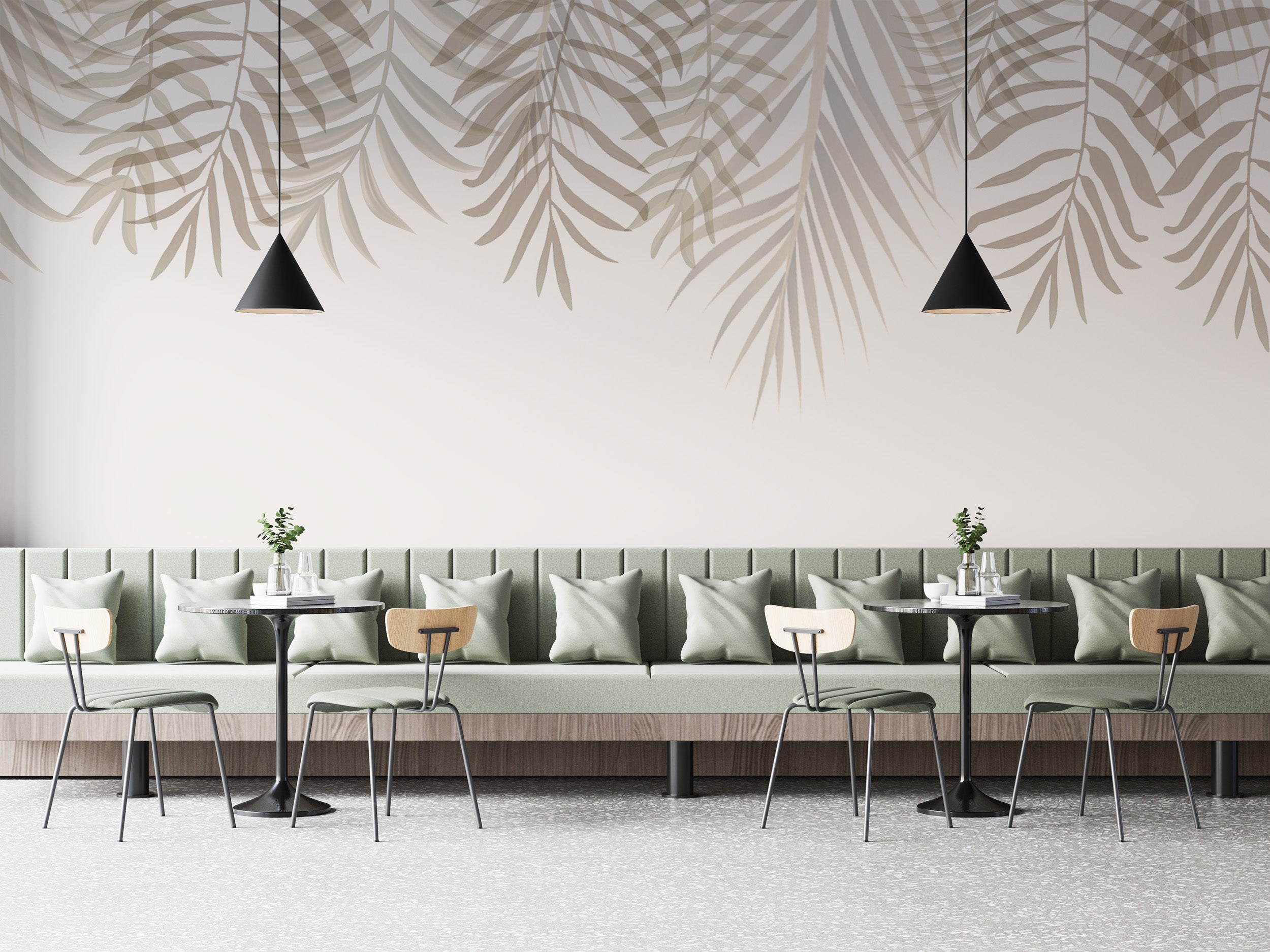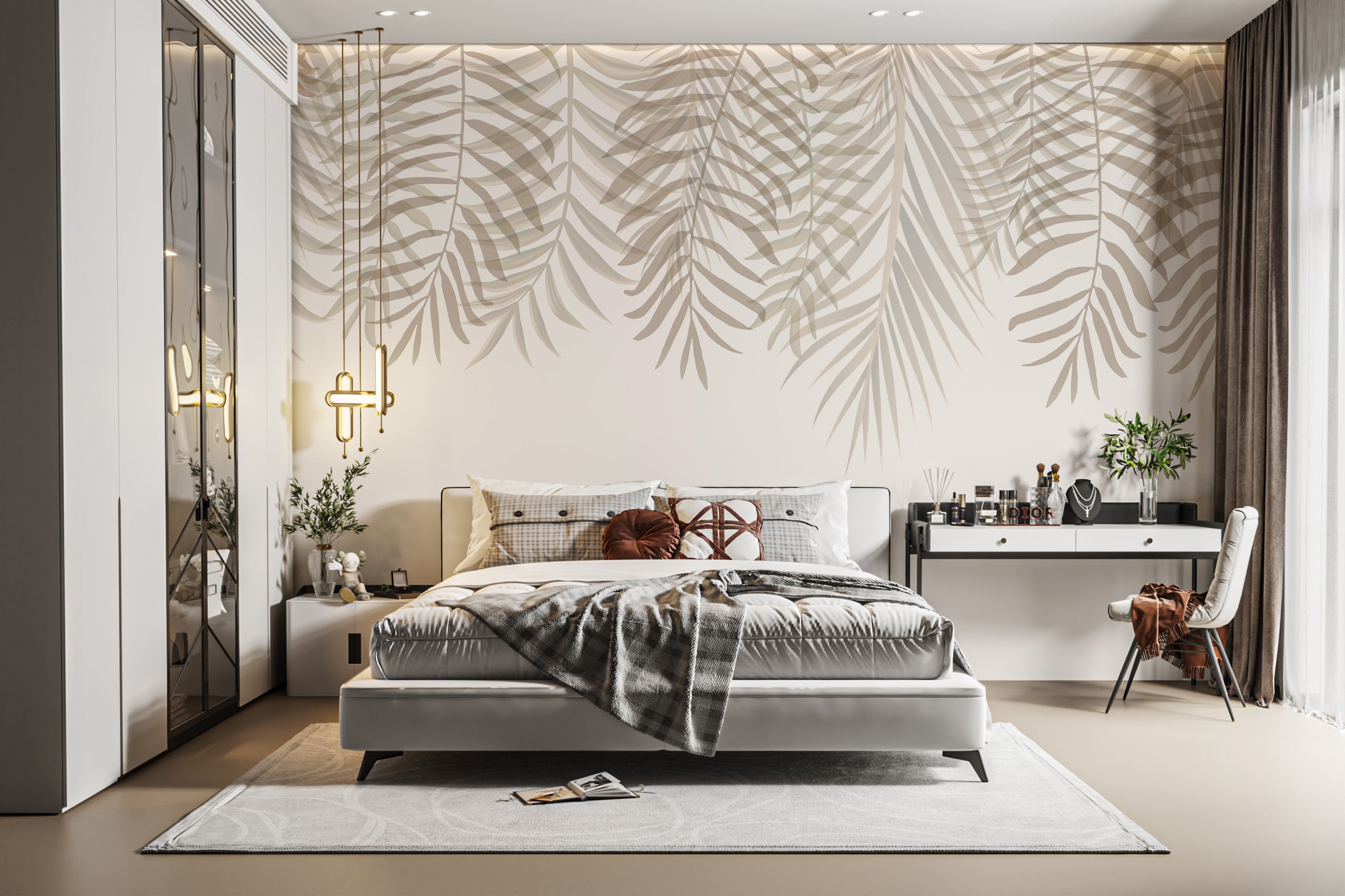 The serenity palm fronds wallpaper mural is an ode to the understated beauty of nature. This leaves wallpaper features a cascade of palm fronds, rendered in soft, neutral tones that evoke a sense of calm and simplicity. Ideal for those seeking a touch of the tropics without overwhelming their interiors, this design blends effortlessly with any decor style. The subtle play of light and shadow across each leaf brings a three-dimensional quality to this tropical wallpaper, creating an organic, soothing presence in a bedroom, living area, or workspace. This mural invites a breath of fresh air into your home, celebrating the elegant structures and gentle movements reminiscent of a serene, sun-drenched grove. It's a timeless piece that complements the peaceful moments of everyday life.