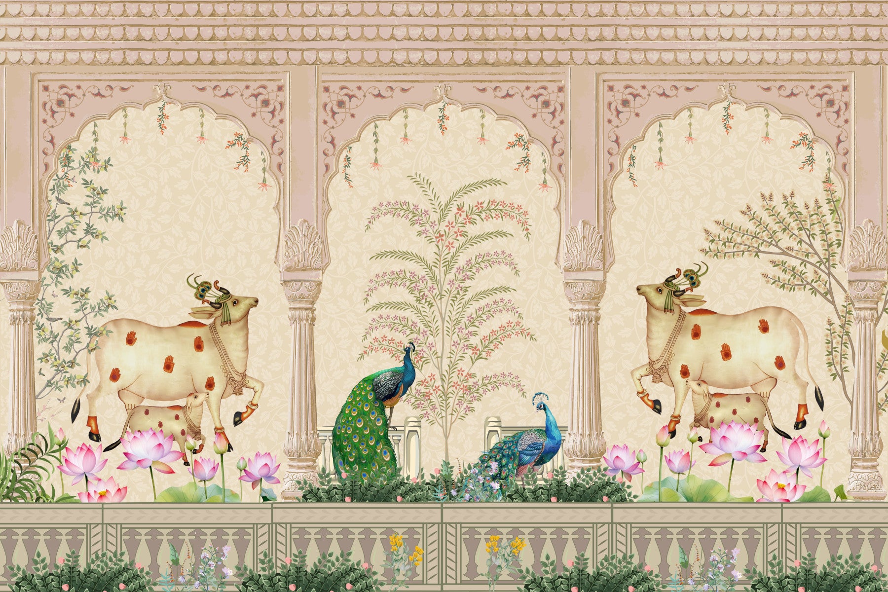 Step into the serene opulence of 'Shahi Aangan', a digital wallpaper that captures the essence of a royal Indian courtyard. This exquisite design showcases the tranquil beauty of an aangan framed by ornate arches, reminiscent of Mughal architecture. Graceful peacocks, symbols of beauty and royalty, stroll amidst blossoming flora, while sacred cows, revered in Hindu tradition, add an element of serenity and reverence. The soft, muted color palette evokes a sense of timeless elegance, creating a soothing ambiance. Lotus flowers, representing purity and enlightenment, bloom alongside lush greenery, further enriching the scene. Transform your space into a peaceful sanctuary with 'Shahi Aangan', where tradition meets artistry in perfect harmony. This wallpaper is perfect for adding a touch of cultural richness and sophisticated charm to any room.