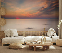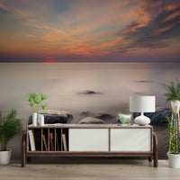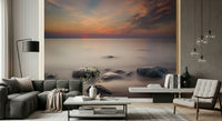 Experience the quiet beauty of a tranquil shoreline. This design showcases smooth, time-worn rocks partially submerged in calm waters, mirroring a soft, gradient sunset sky. Hues of peach, rose, and light blue create a peaceful, airy feel. Transform any space using this wallpaper for walls to provide instant calm and serene charm. Ideal for a bedroom, home office, or bathroom, its calming effect and natural beauty integrate well with various interiors whilst invoking nature's peaceful presence.