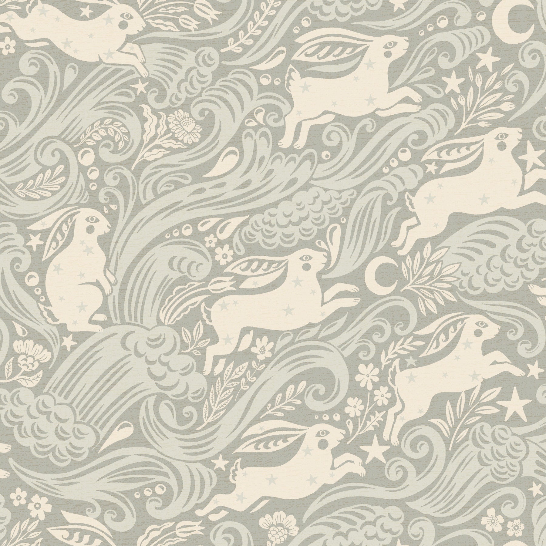 Dive into a dreamscape with the 'Silver Celestial Sea Rabbit' wallpaper. Elegant, off-white rabbits leap across a sea of stylized, silvery-grey waves, adorned with celestial stars and delicate floral flourishes. The calming, muted color palette evokes a sense of serene tranquility, while the whimsical design adds a touch of enchanting magic. This wallpaper is perfect for those seeking a sophisticated yet playful aesthetic, bringing a touch of celestial wonder to any space. The repeating pattern creates a seamless, ethereal flow, ideal for desktops, laptops, or mobile devices. Prepare to be captivated by this harmonious blend of nature's beauty and the mystery of the cosmos.