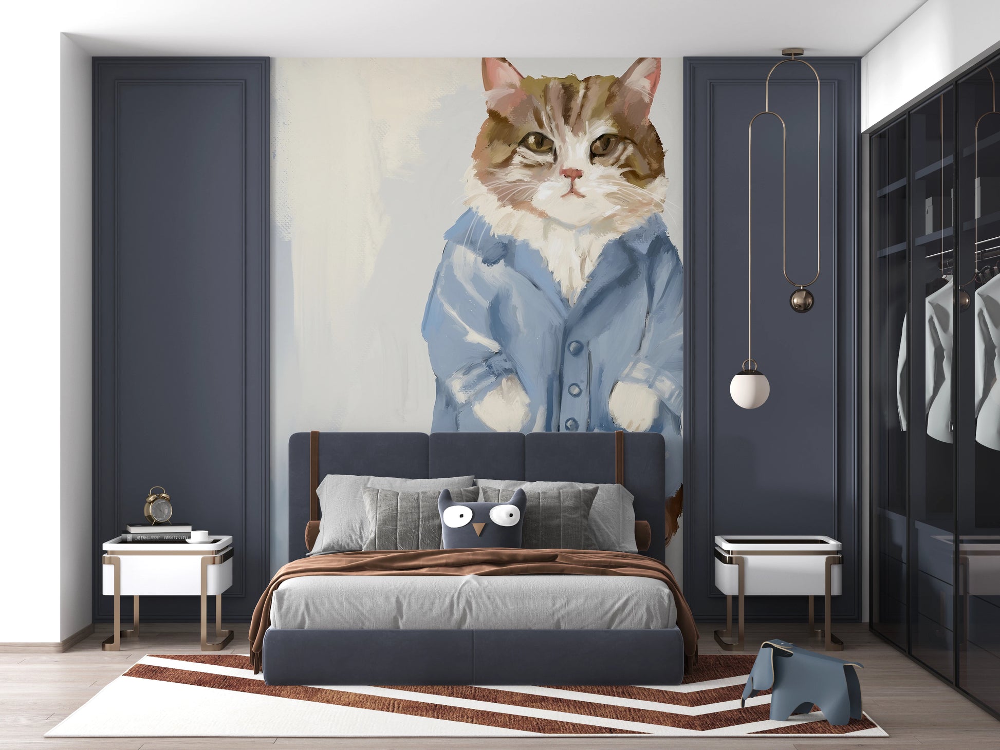 Transform any wall into a gallery piece with this hand-painted illustration of a cat in a blue jacket. The textured brushstrokes bring visual interest and depth to your walls. The soothing colour palette of blues, browns, and creams creates a relaxed atmosphere in any room. This wallpaper for walls works wonderfully in a child's room, adding a playful touch. Alternatively, use it in a reading room to create a cosy and imaginative corner. This design enhances the aesthetic of your interior spaces, giving them a distinctive and cosy appeal.