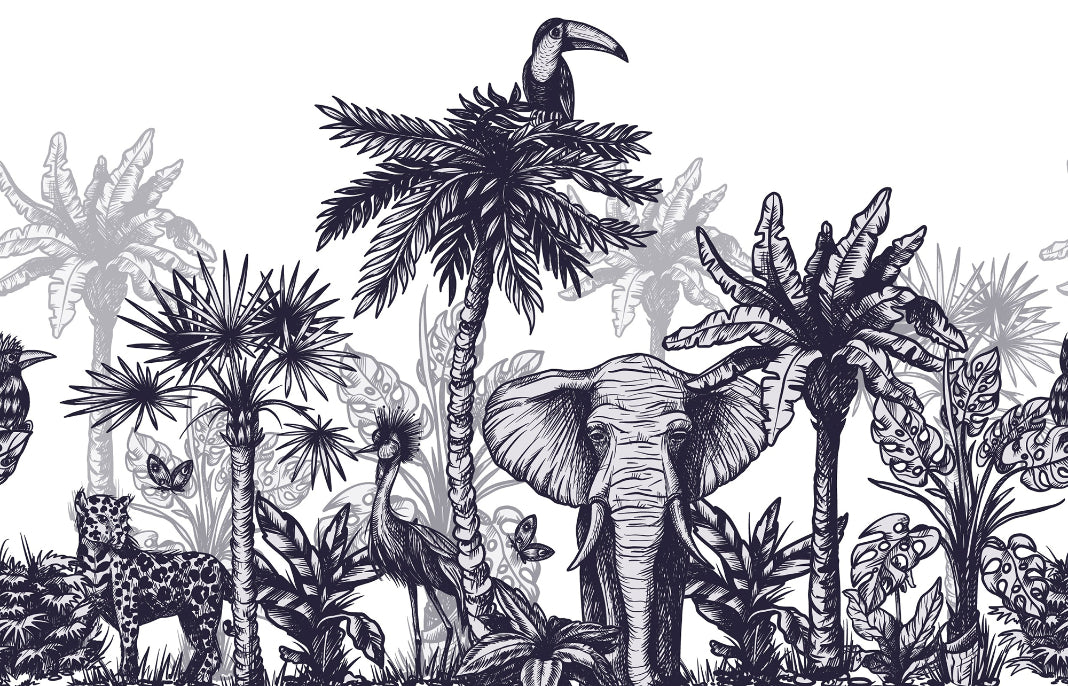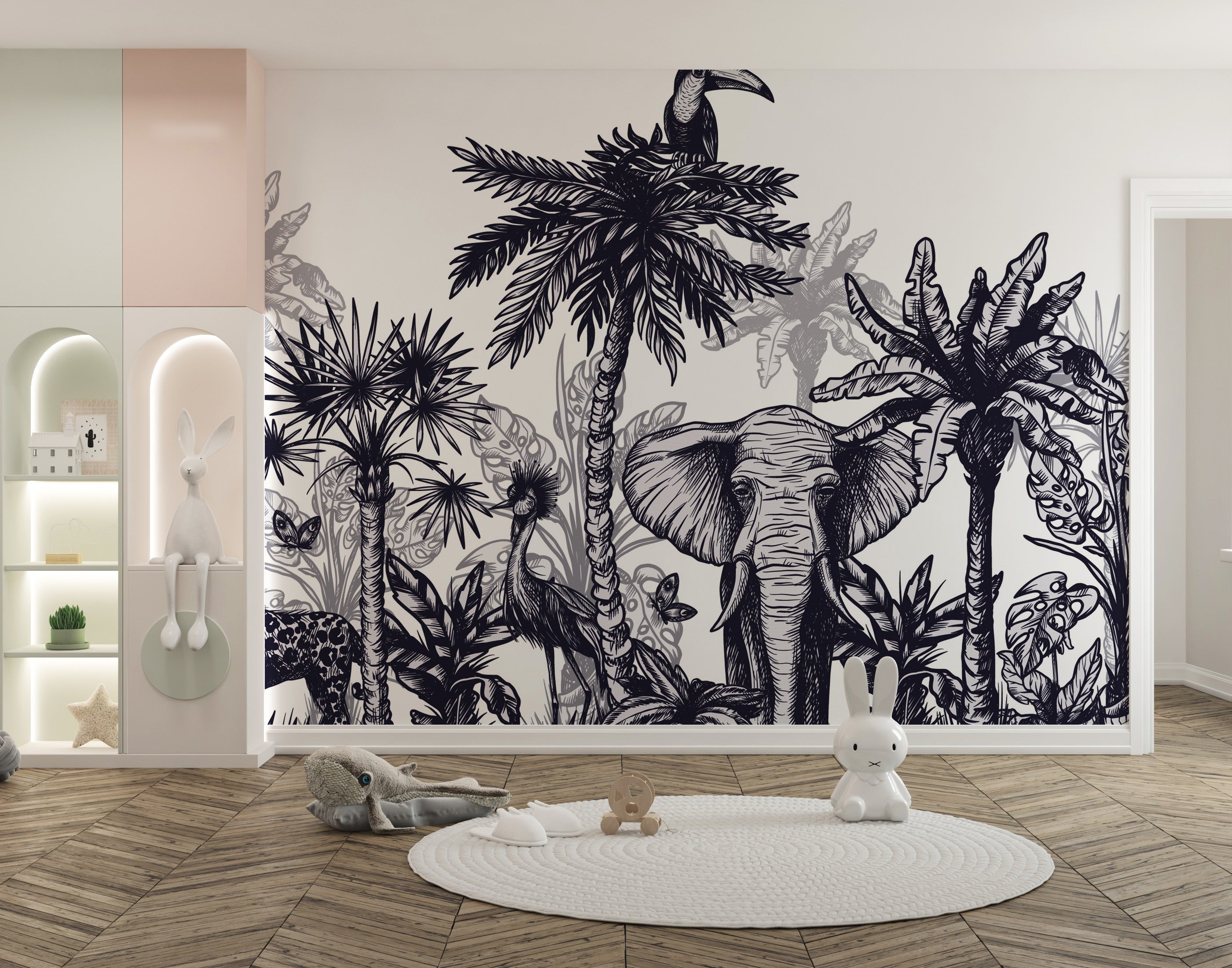 Introducing this sketchy forest jungle animals mural wallpaper is an innovative way to revamp the aesthetic of your living room. This art piece brings a vibrant breath of life to any interior, featuring a lush tableau of jungle creatures etched in a striking monochrome sketch style. Dominated by the majestic elephant at its centre, the design is a harmonious assembly of flora and fauna, with a leopard in repose and tropical birds, including a toucan perched aloft. Palms and other exotic plants create a sense of depth and dimension, turning a simple wall into a focal point of natural beauty and artistic flair. Perfect as living room wallpaper, it creates a visual narrative that captivates and adds character to your domestic landscape.