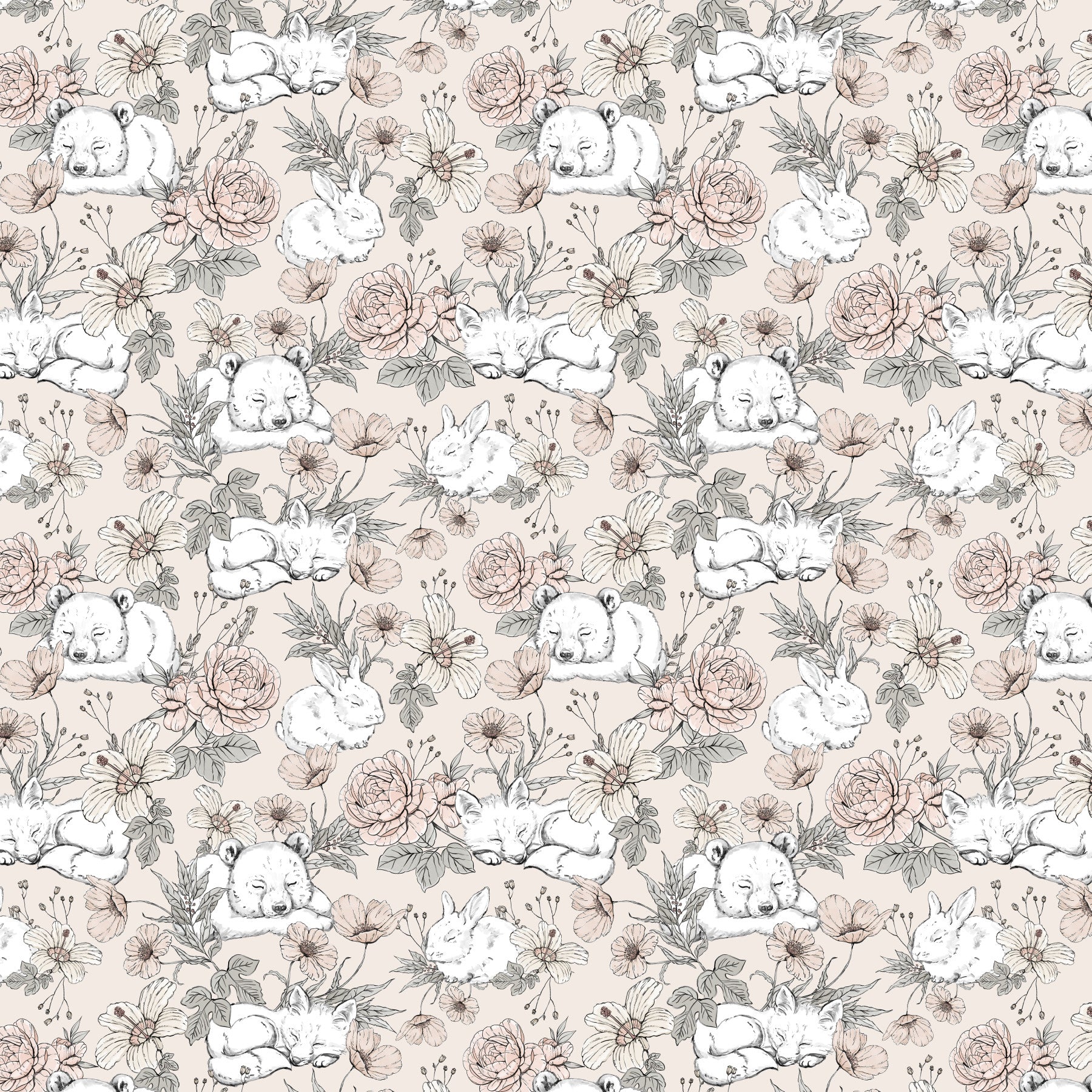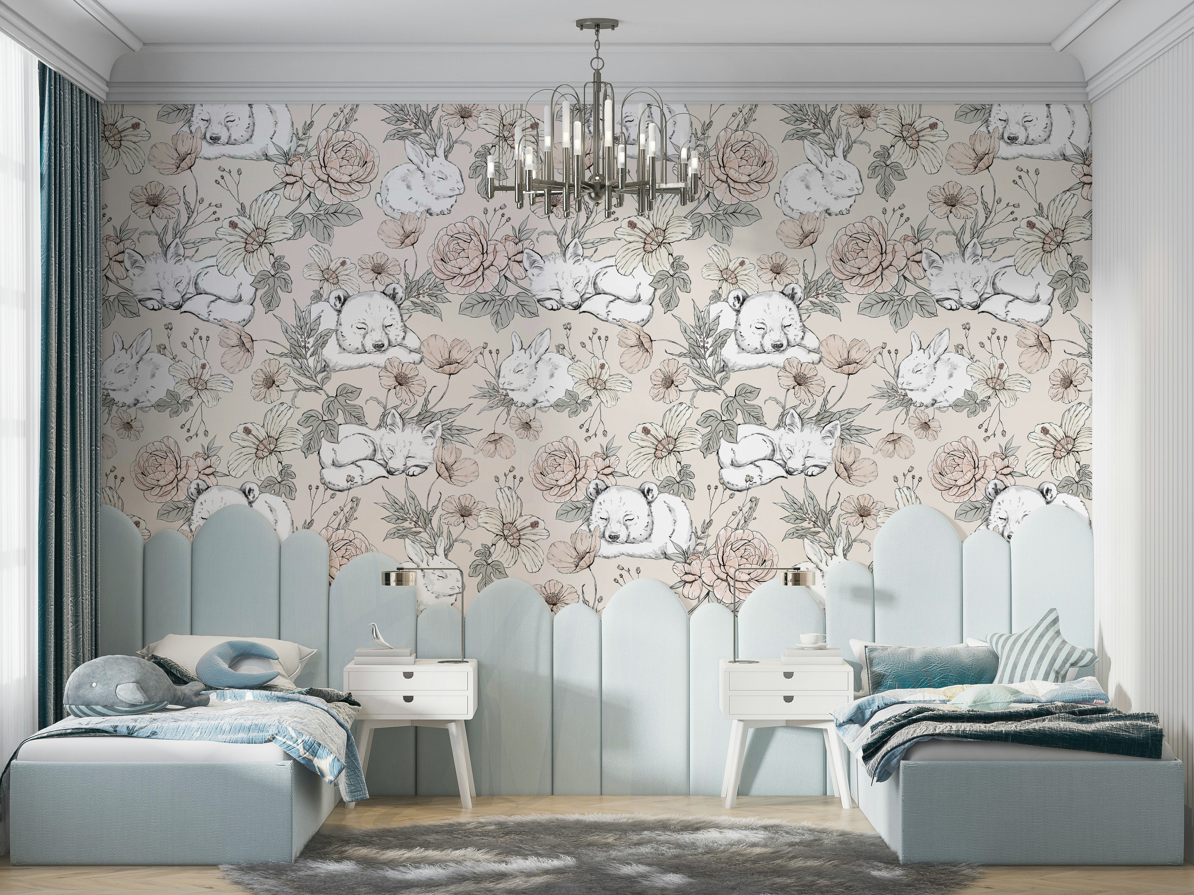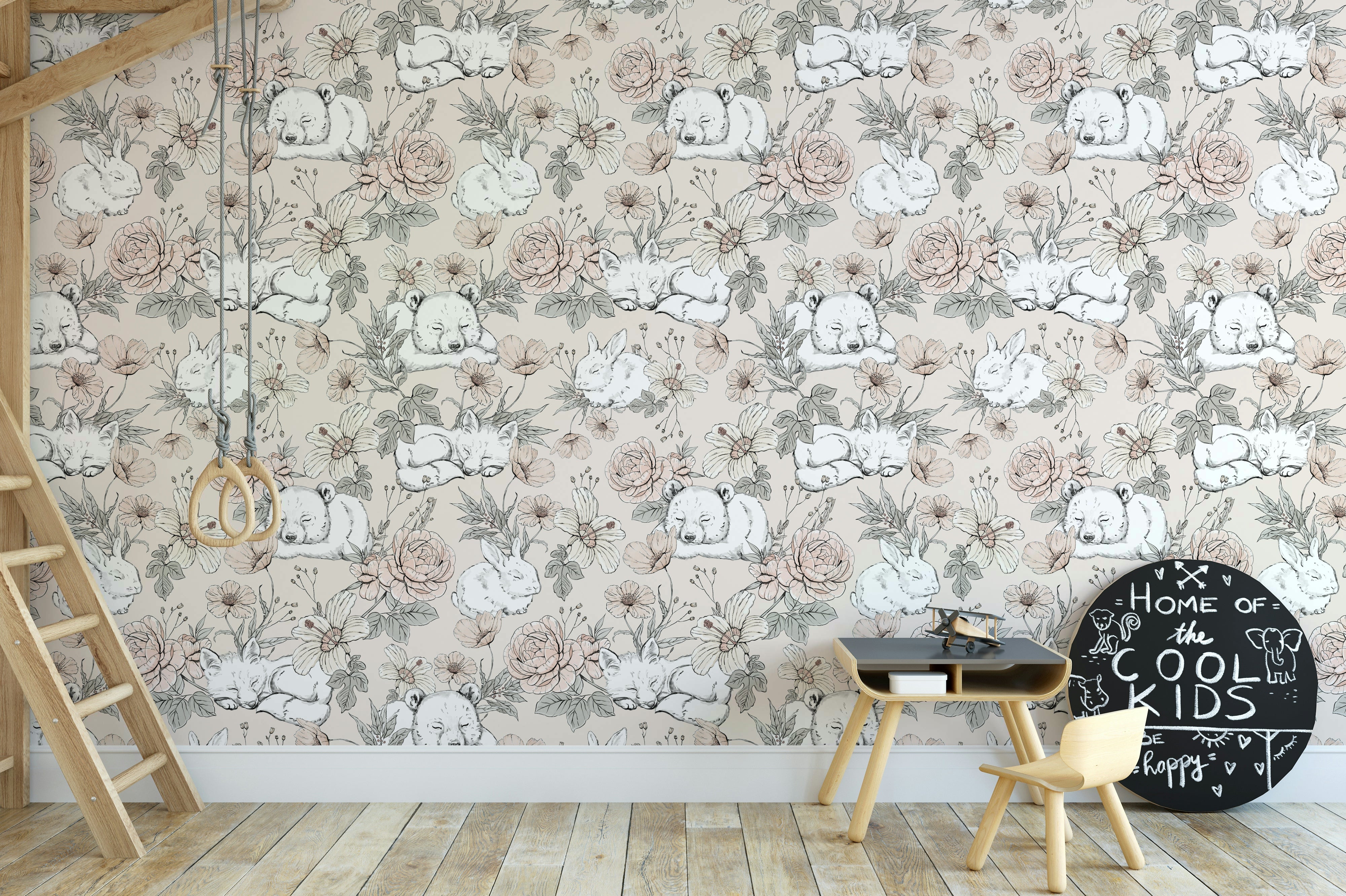 Wrap your child’s room in the gentle warmth of our Sleeping Woodland – Beige wallpaper. Set against a soft beige background, this design features sweetly slumbering koalas, foxes, and bunnies nestled among hand-drawn florals in muted tones. It’s the perfect choice for creating a tranquil nursery or toddler space that soothes and inspires. The vintage sketch style and neutral palette bring a timeless, storybook charm that blends beautifully with any décor. Whether you're designing a dreamy corner or a full feature wall, this wallpaper turns every nap and bedtime into a peaceful forest escape.