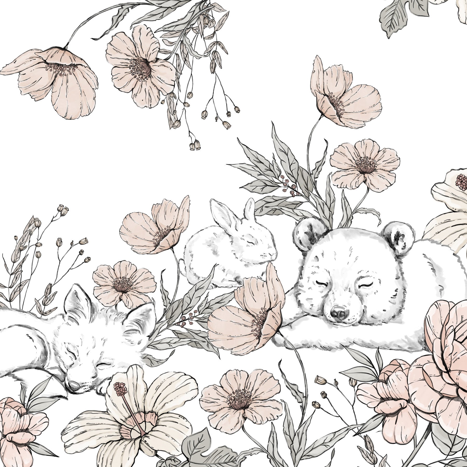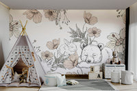 Drift into a world of peace and whimsy with the Sleeping Woodland Mural Wallpaper by designer Ewa Brzozowska for Giffywalls. This enchanting mural showcases a fox, bunny, and bear peacefully asleep among delicate hand-drawn florals and leaves, brought to life in a soothing neutral palette. Ewa’s signature soft, storybook style makes this mural ideal for nurseries, playrooms, or any space in need of a calming touch. Thoughtfully illustrated and rich in charm, it invites serenity while sparking the imagination. Let this mural wrap your walls in the gentle hush of the forest, where every nap feels like a fairy tale.