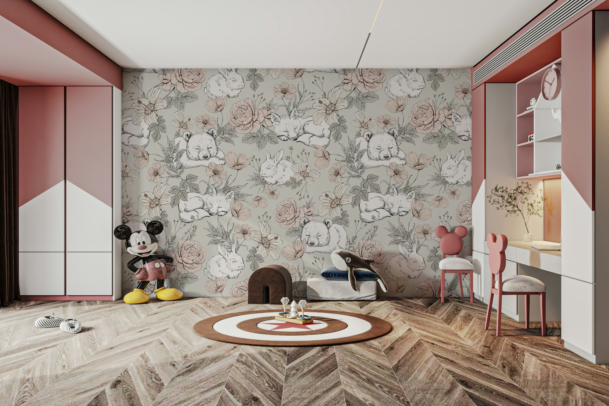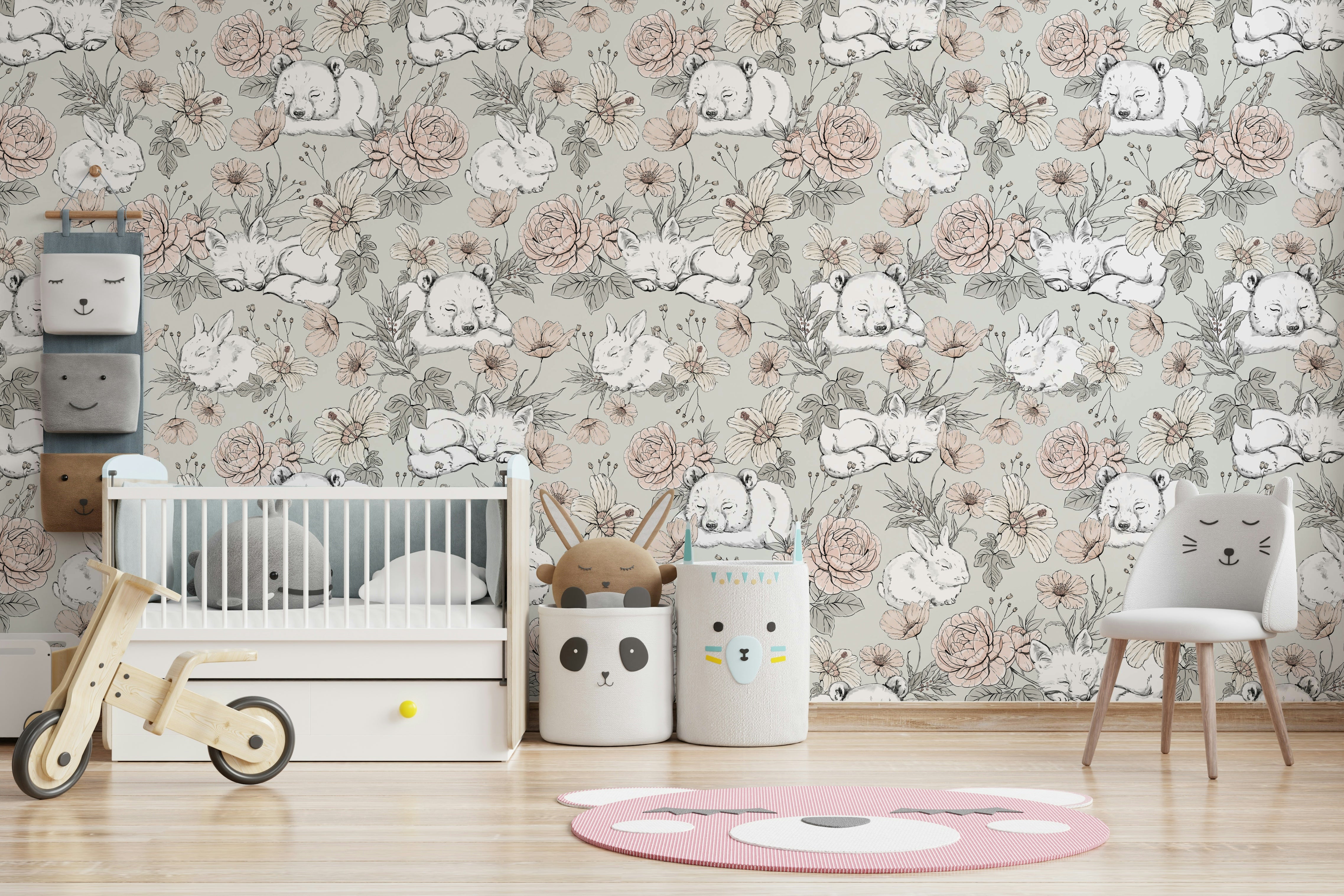Drift into a gentle woodland dreamscape with our Sleeping Woodland – Sage Green wallpaper. Featuring softly sketched foxes, koalas, and bunnies nestled among hand-drawn florals, this design evokes peaceful forest scenes in delicate, earthy tones. The sage green backdrop adds a touch of natural calm, making it ideal for nurseries, reading corners, or toddler rooms. Every glance invites quiet wonder, helping little ones relax and feel at ease. Crafted for easy application and lasting charm, this wallpaper turns any wall into a whimsical retreat. Let your child’s space bloom with nature’s quiet magic and cuddly woodland friends.