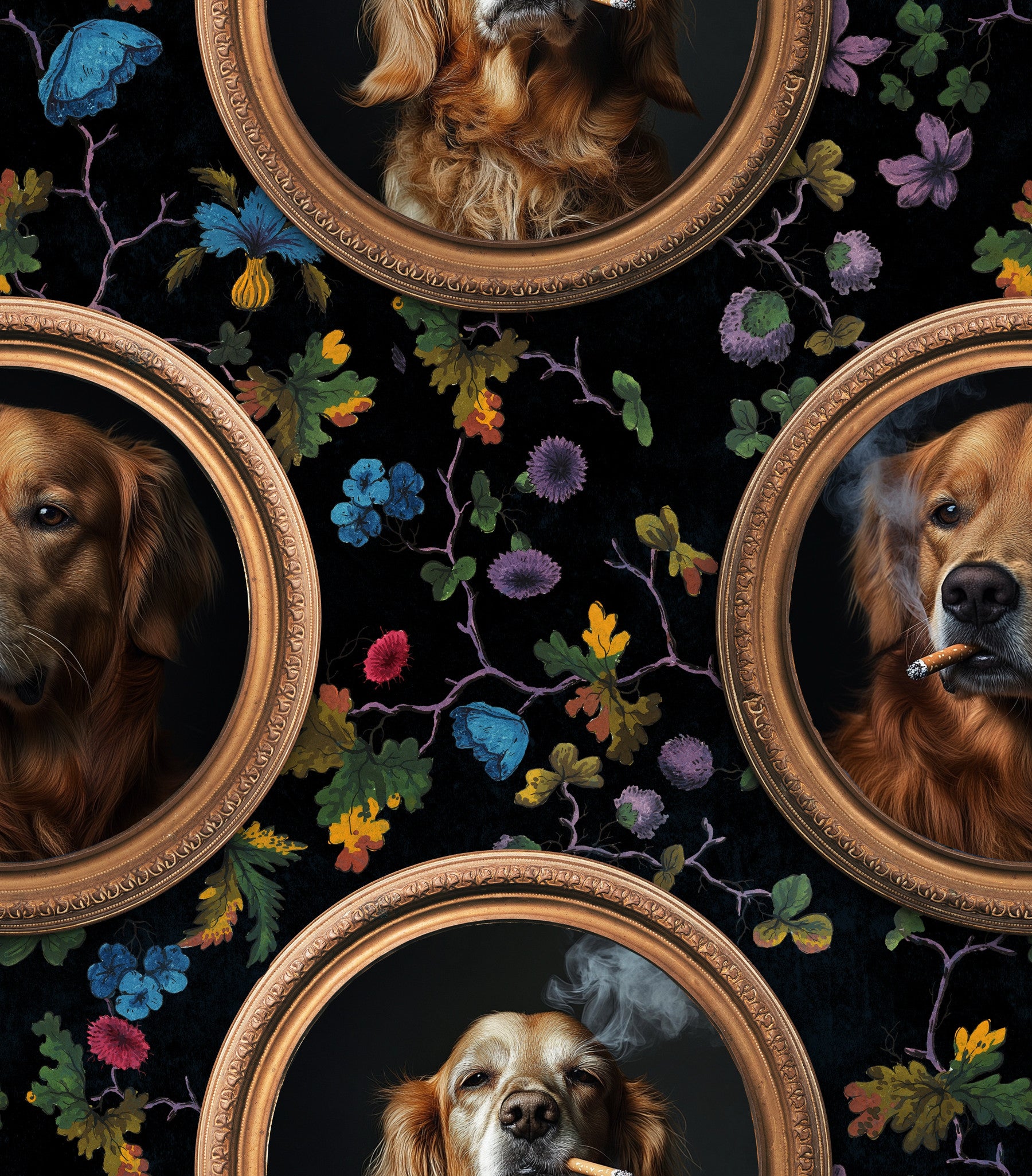 Add a bold statement to your space with this unusual 'Smoking Dogs in Gold Frames' wallpaper for walls by Uta Naumann. The design features stately golden retrievers in ornate gold frames, each with a cigar, set against a floral backdrop. The wallpaper's dark background contrasts with the gold accents. This wallpaper for walls works great in living rooms, home offices, or dining rooms. This design complements eccentric and unique interiors for a bold effect.