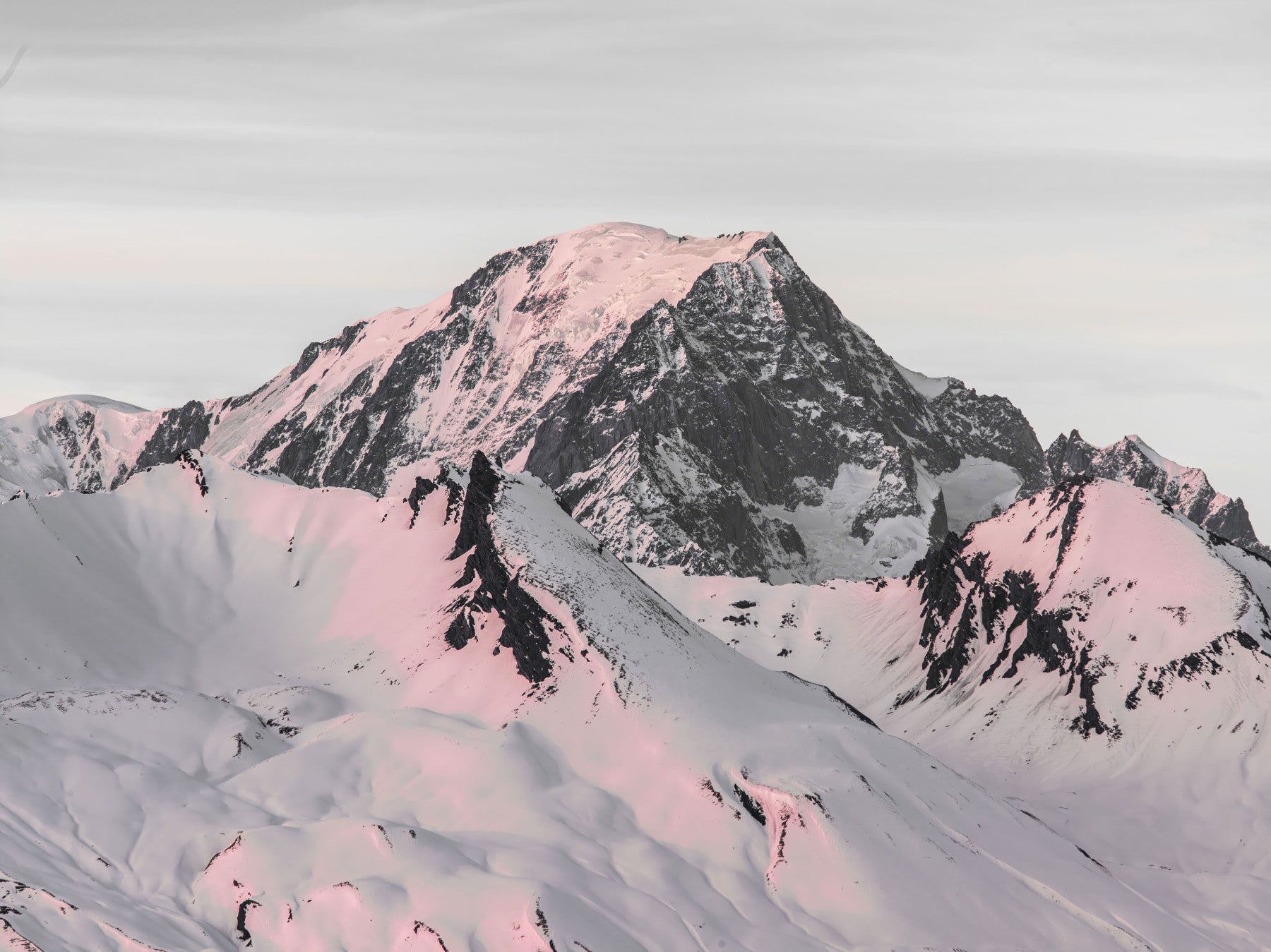Serene snowcapped mountain mural with pinkish tones and sharp peaks.