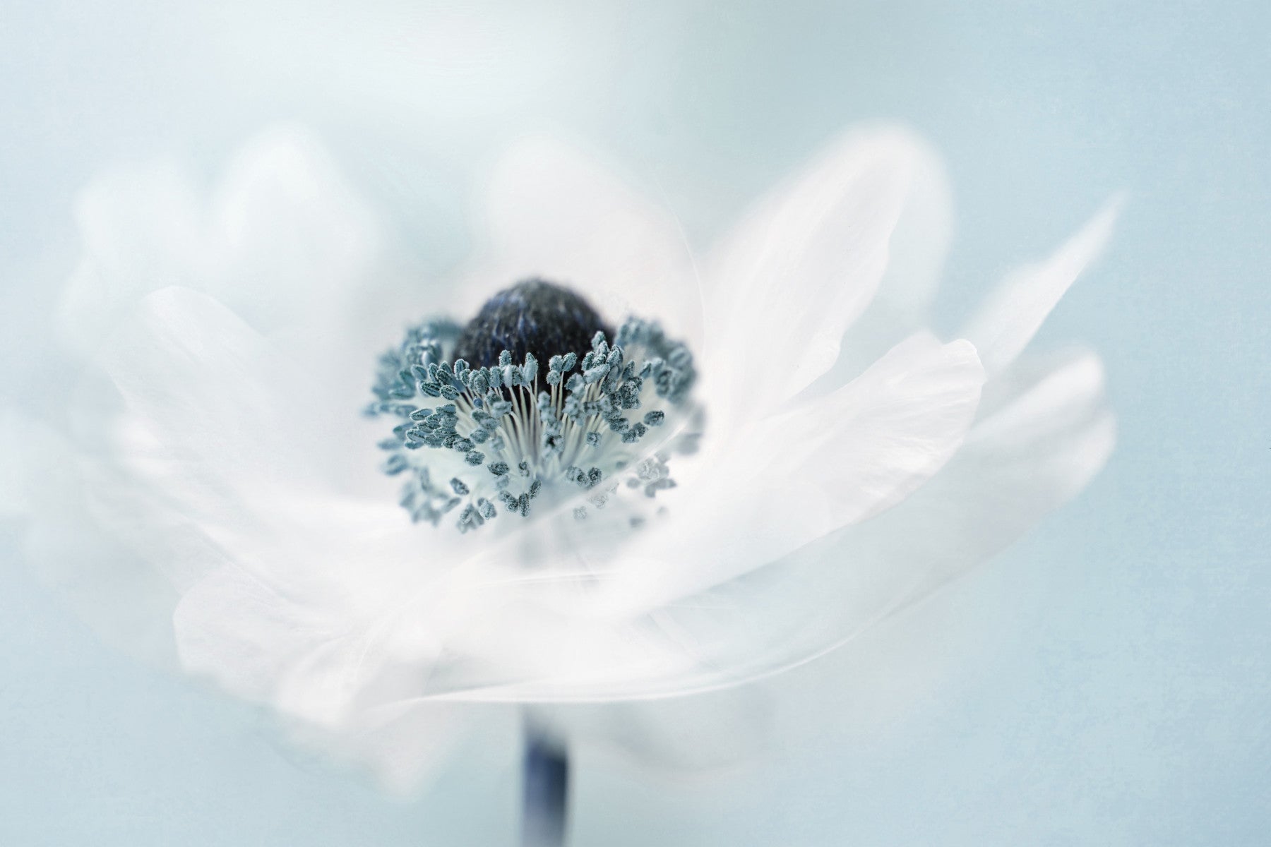 Bring a touch of nature inside with this minimalist floral wallpaper. The image showcases an anemone flower in soft focus, with gentle blues and whites creating a soothing effect. This wallpaper for walls brings a light, airy feel to any space. It's perfect for a bedroom, bathroom or hallway. The design works well with both modern and classic interiors, adding a hint of tranquility to your home.