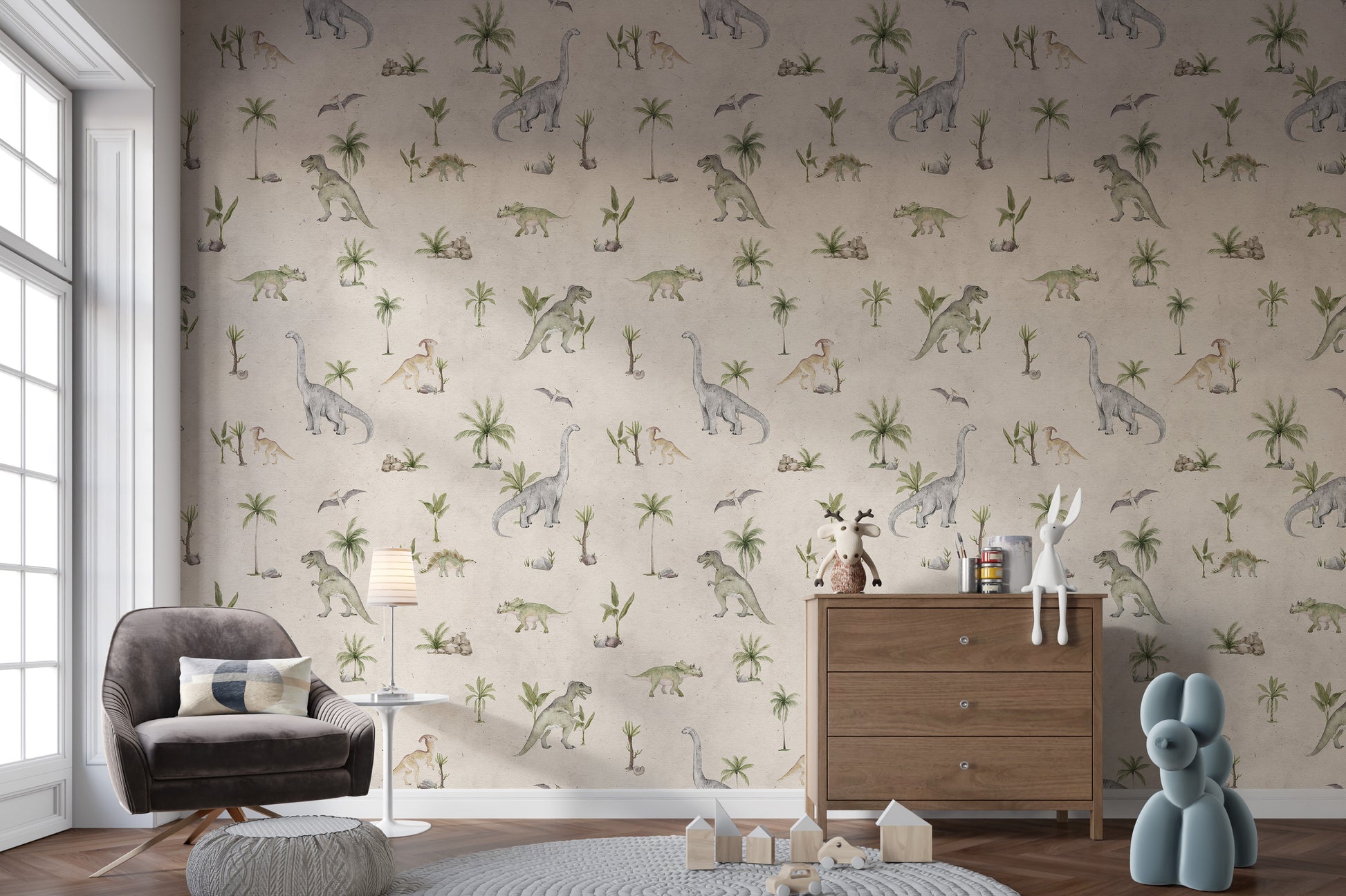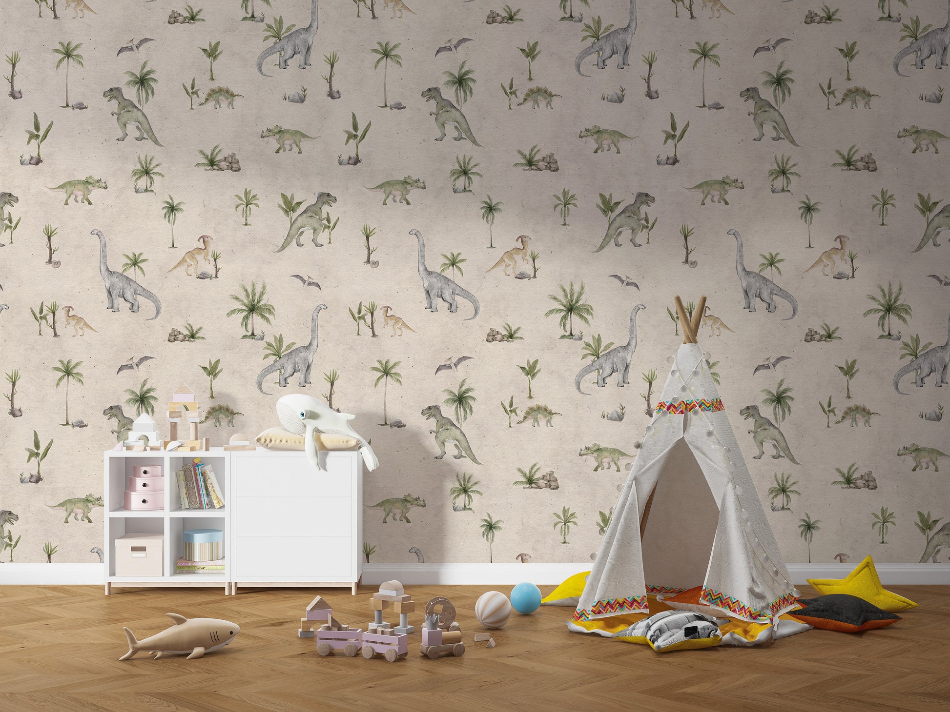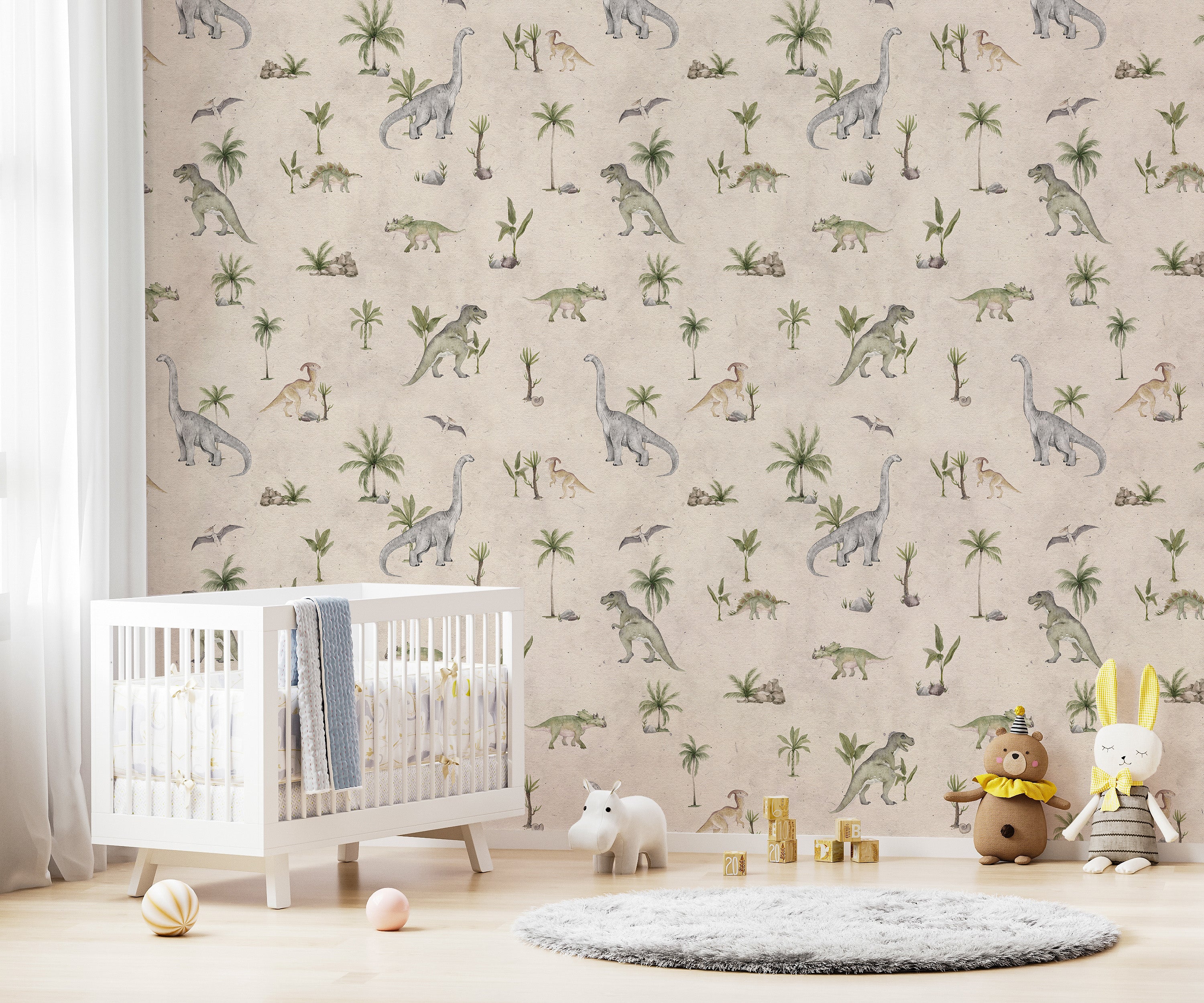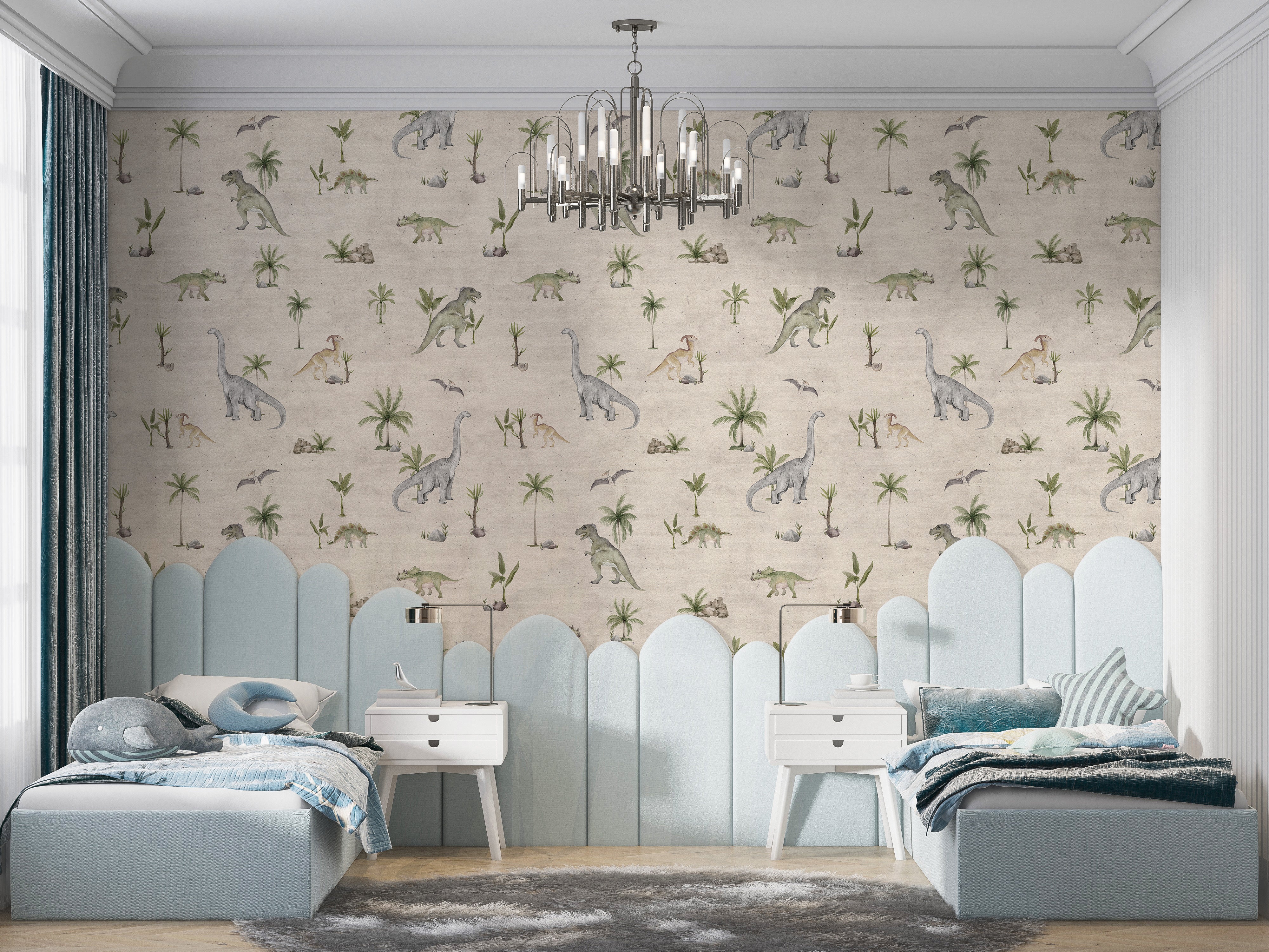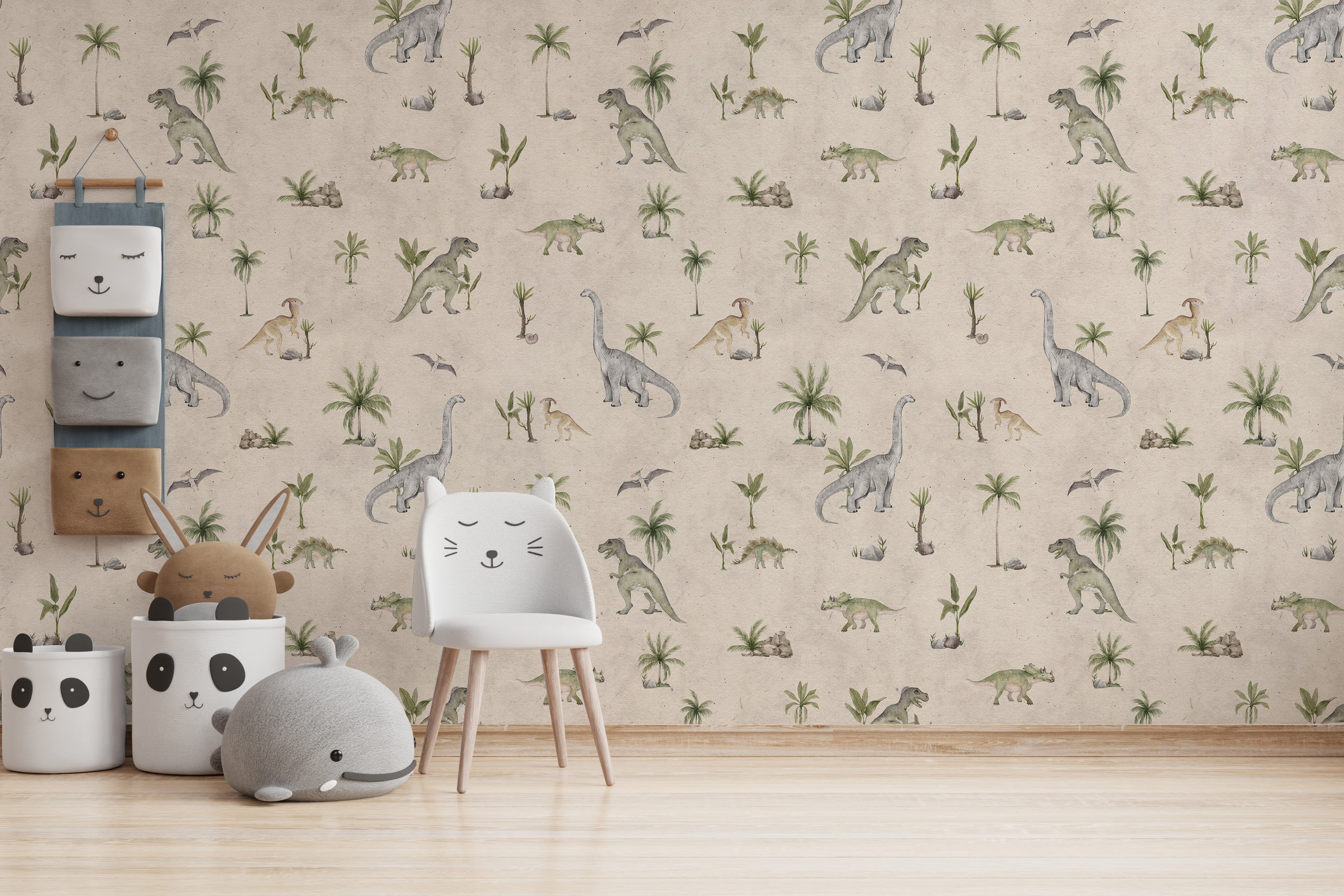 Give your child's room a gentle touch with soft beige dinosaur wallpaper. The muted tones of beige paired with playful dinosaur illustrations create a warm and inviting atmosphere. Perfect for a nursery or toddler's room, this wallpaper offers a calm yet adventurous vibe, encouraging imagination while providing a soothing environment for rest. Whether you're looking to design a fun feature wall or enhance the entire room, this design brings a soft, timeless look that pairs well with various furniture and accessories.