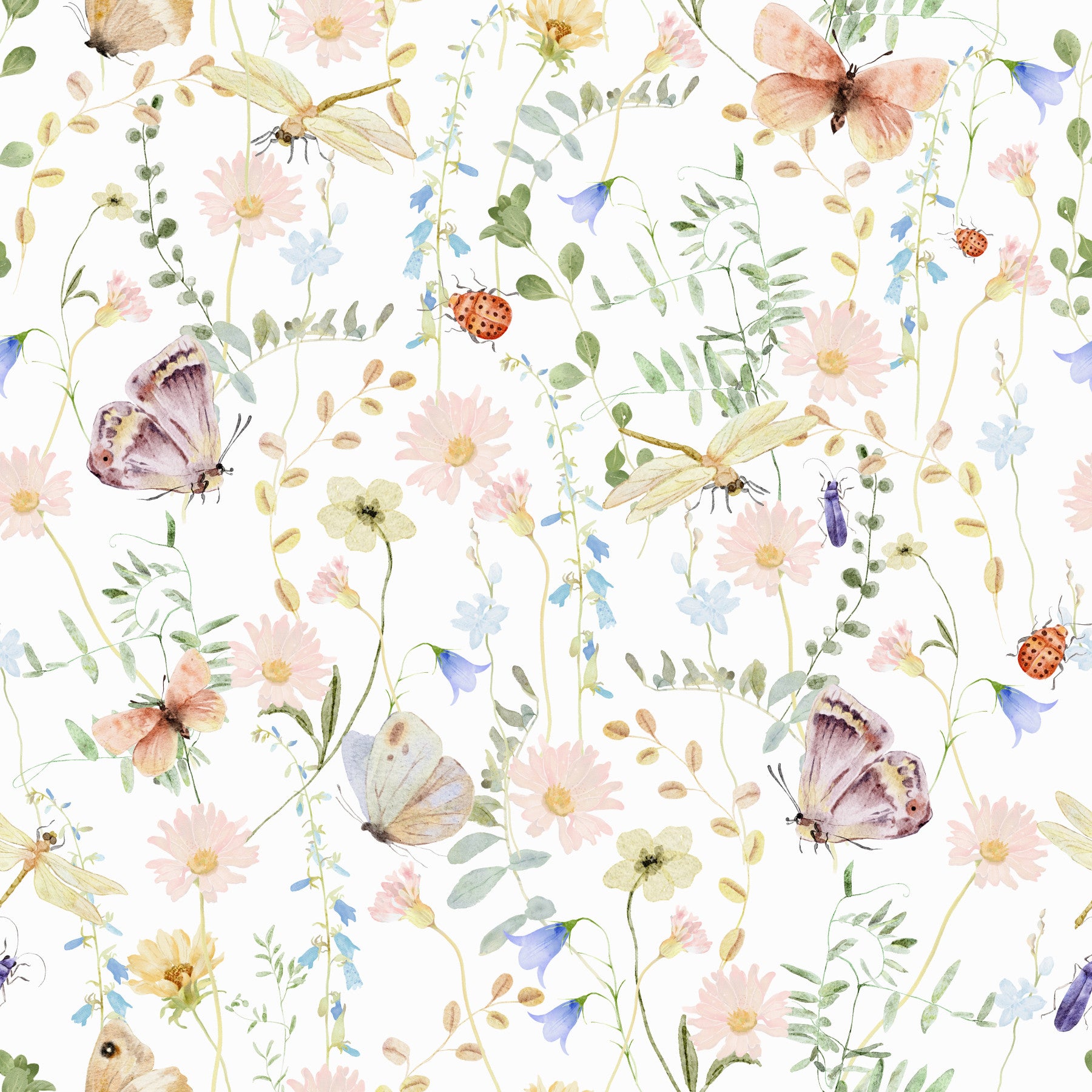 This wallpaper by Uta Naumann features delicate watercolour wildflowers, graceful butterflies, and charming ladybirds scattered across a clean white backdrop. Soft pinks, blues and greens create a serene, natural scene. The brushstroke texture gives it an artistic touch. It will brighten any room. Use this wallpaper for walls in nurseries, bedrooms or living rooms. This design complements interiors with a fresh, airy feeling. Enjoy a touch of the outdoors inside your home.