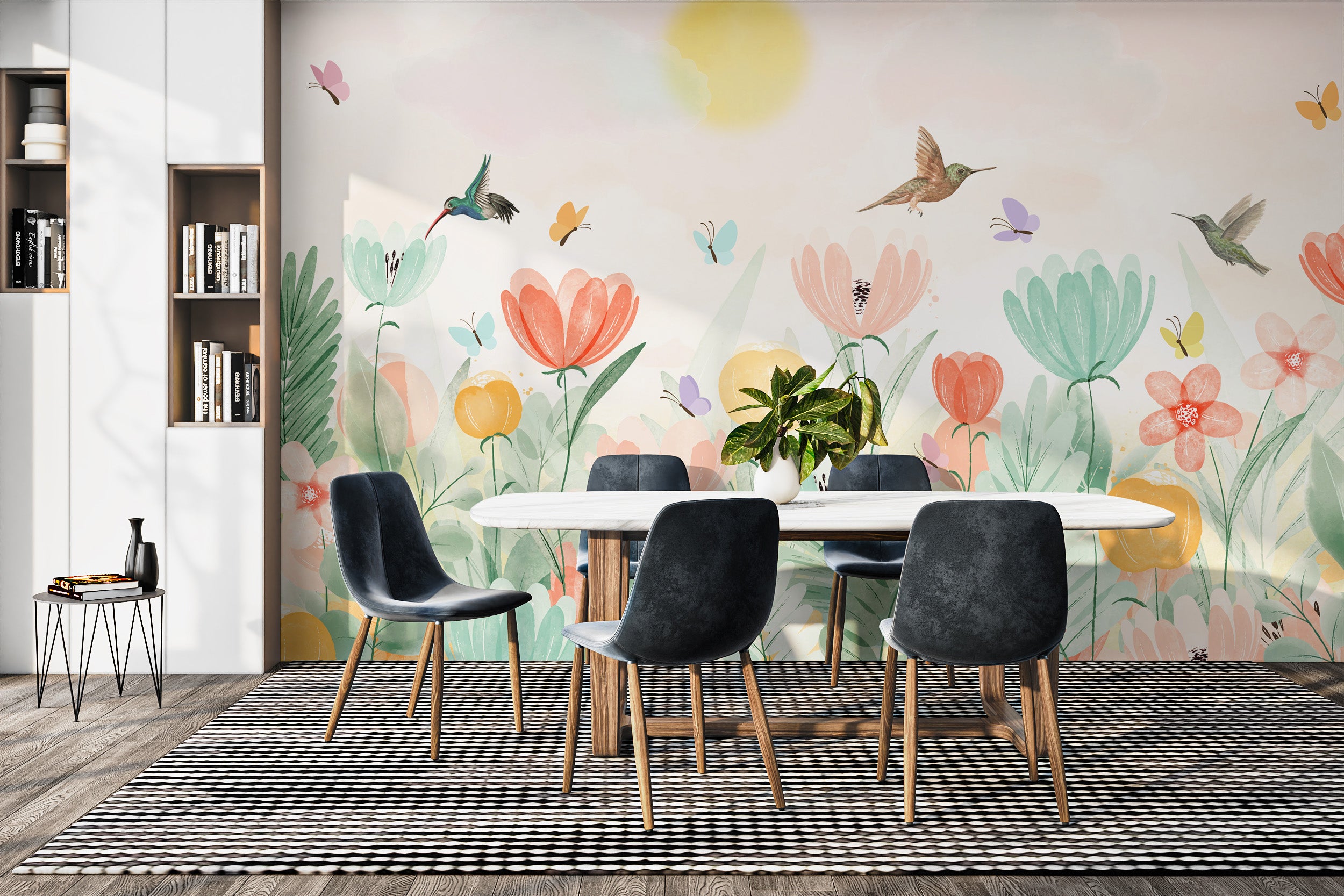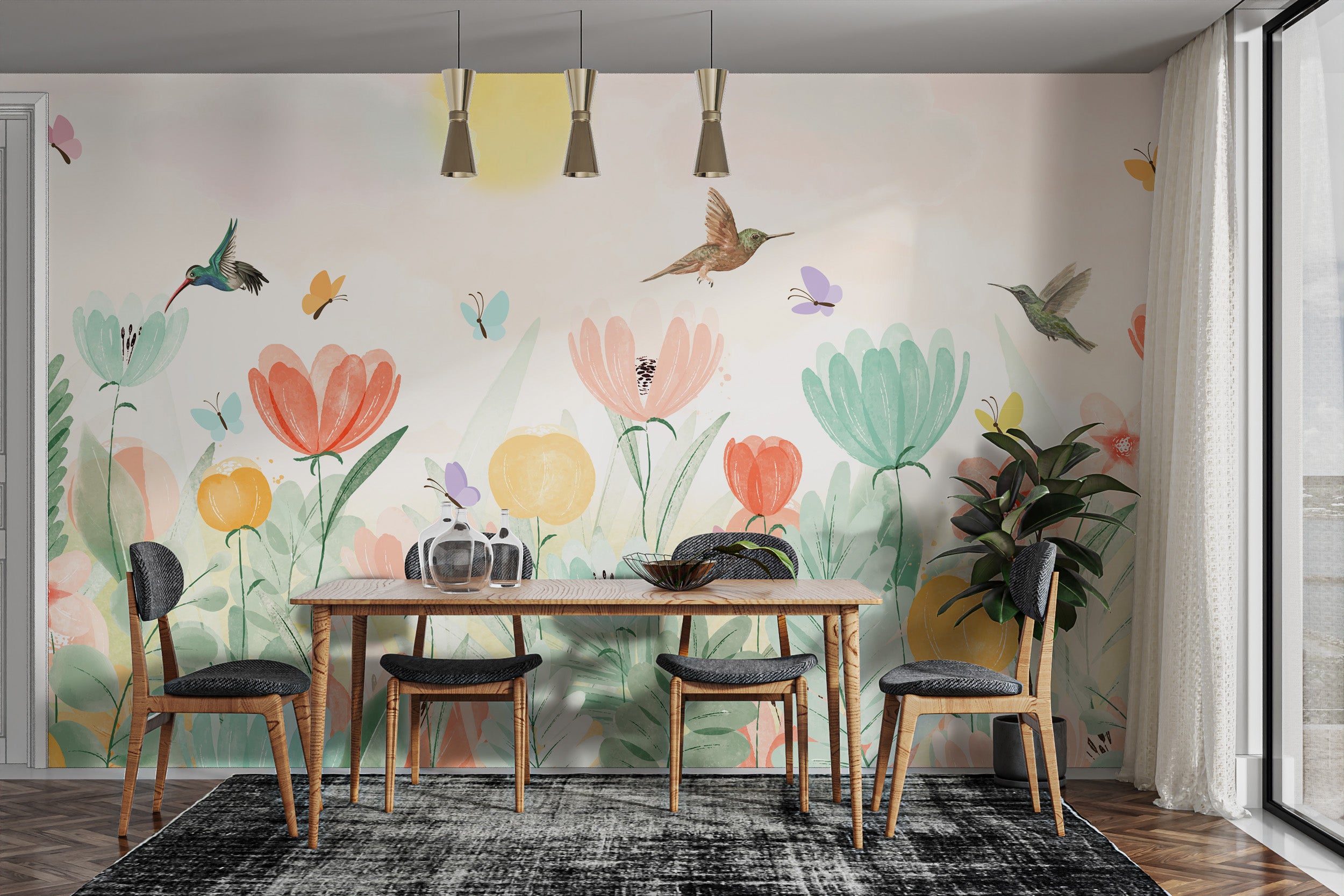 Elevate any room with the soft pastel spring garden mural, a harmonious blend of watercolor florals and spirited birds in flight. This enchanting flower wallpaper merges delicate hues and gentle brush strokes, creating a peaceful retreat right on your wall. As a birds wallpaper, it showcases the whimsical dance of hummingbirds amongst blooms, infusing your home with the freshness of a spring morning. Ideal for those who wish to bring the subtle charm of nature indoors, this spring flower wallpaper mural is a celebration of new beginnings and the simple joy that flowers and fauna can bring to everyday life. Perfect for living spaces or a child's room, it's an artful escape into a world of soft pastels and serene beauty.