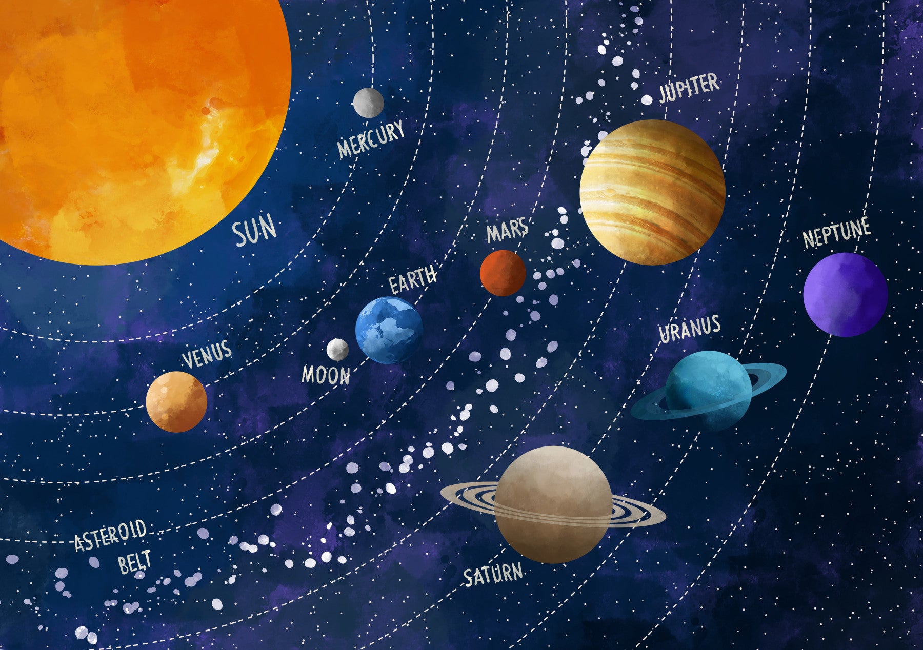 Embark on an interstellar journey with this captivating wall décor piece, titled 'Solar System Adventure'. The design showcases a whimsical yet informative rendition of our solar system, set against a backdrop of deep indigo sprinkled with stars. From the radiant sun blazing in vibrant orange, to the icy depths of Neptune in shades of purple, each planet is carefully rendered with its own distinctive colours and textures. Saturn's majestic rings, Jupiter's swirling storms, and the rugged terrain of Mars are all brought to life in delightful detail. Dotted lines illustrate the orbital paths, guiding the eye on a cosmic voyage. The asteroid belt adds texture. Spark imagination and wonder with this charming depiction of the universe, a perfect addition for any room seeking a touch of cosmic exploration.