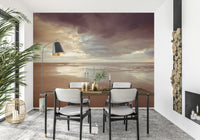 Tranquil beach sunset. Escape to a tranquil coastal vista with "Soothing Seashore". This stunning wallpaper captures the serene beauty of a vast, sandy beach at twilight, where the sky meets the sea in a seamless blend of muted hues. Rolling, textured clouds dominate the upper portion of the image, their gentle, earthy tones creating a calming atmosphere. The wet sand reflects the ambient light, creating a mirror-like effect that amplifies the sense of spaciousness and peace. The horizon stretches far into the distance, offering a visual escape from the everyday. Subtle details in the sand reveal the ebb and flow of the tide, grounding the image in the natural rhythm of the ocean.