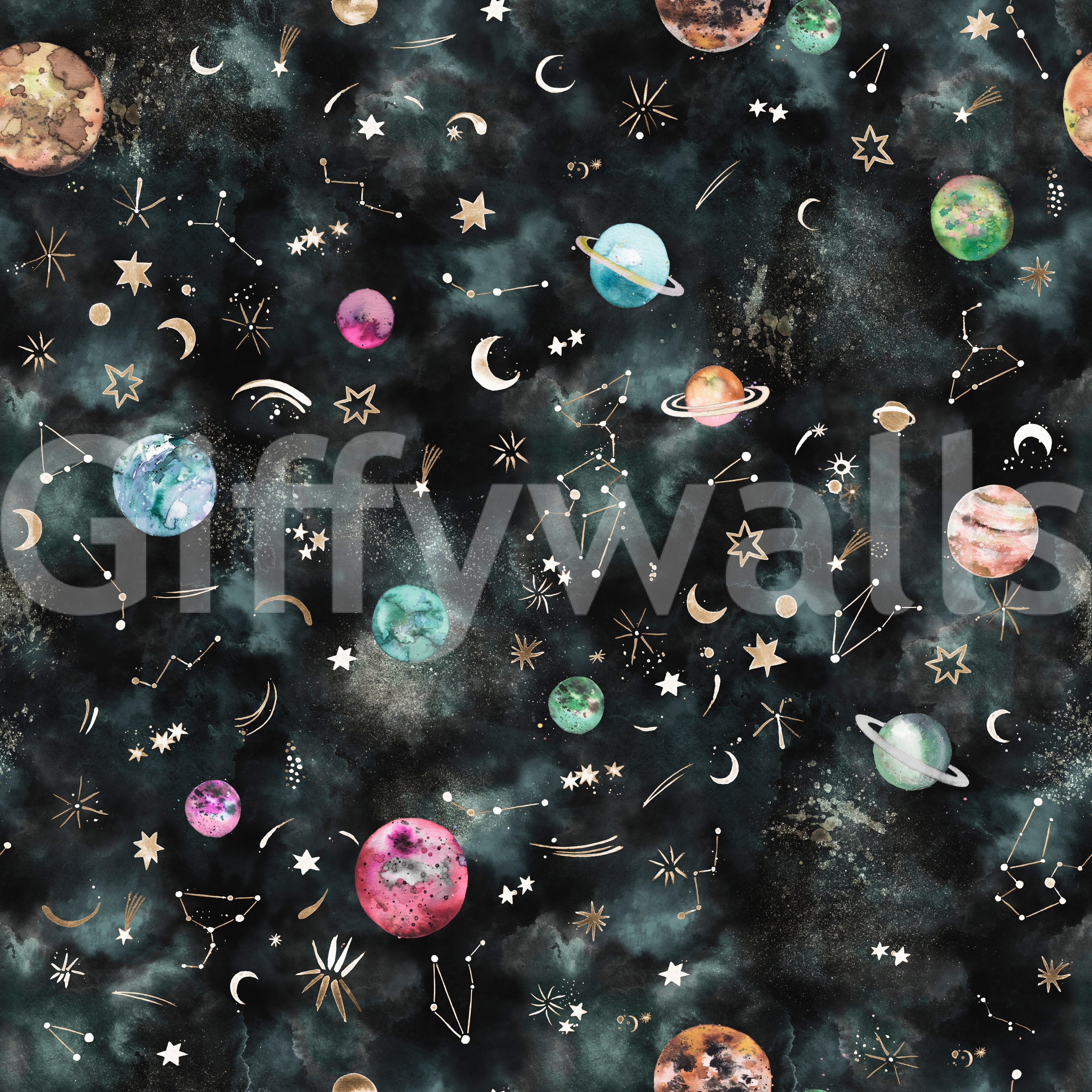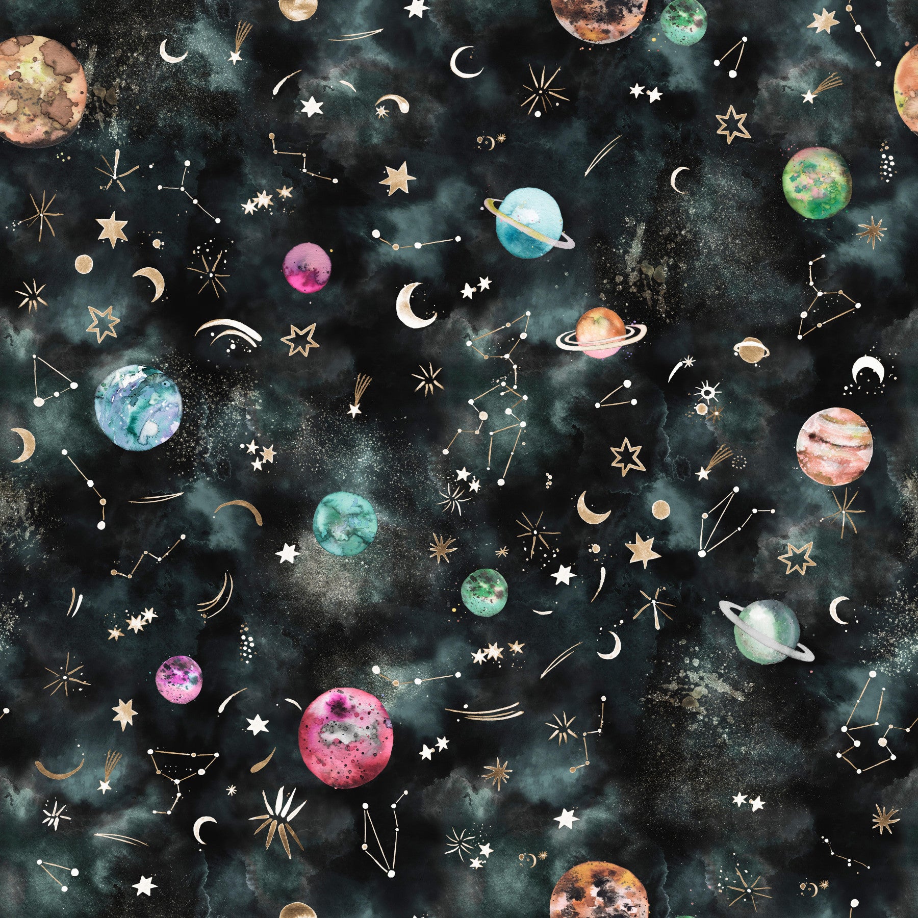 Embark on a celestial journey with this captivating wallpaper. A dark teal galaxy swirls with watercolor planets in shades of teal, pink, and orange, each uniquely textured. Golden constellations and celestial bodies—shooting stars, crescent moons, and sparkling stars—add a touch of ethereal elegance. This dreamy design perfectly blends astronomy and artistry, creating a peaceful and awe-inspiring cosmic scene ideal for any space enthusiast or anyone who appreciates a touch of magical realism on their screen. The soft, muted tones and delicate details make it a soothing and stylish addition to your digital landscape.