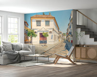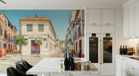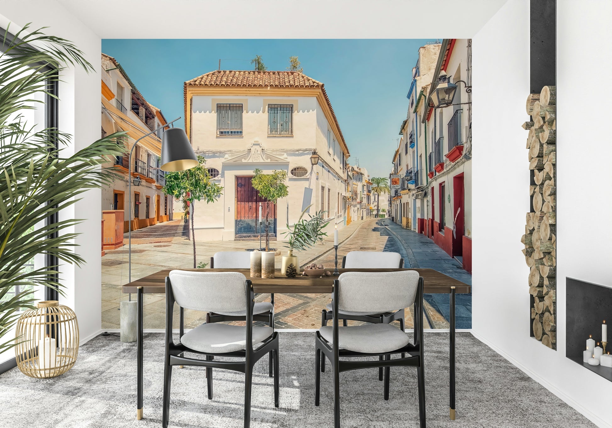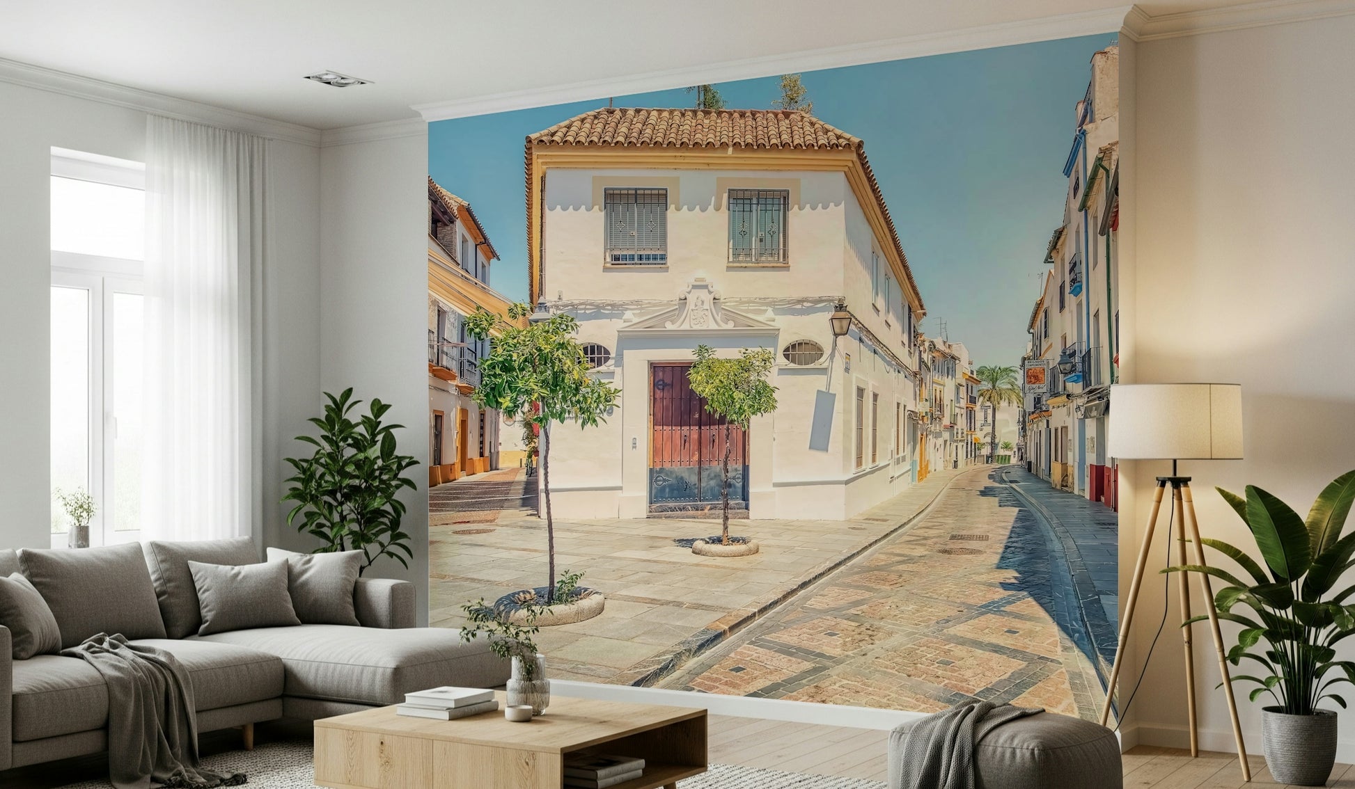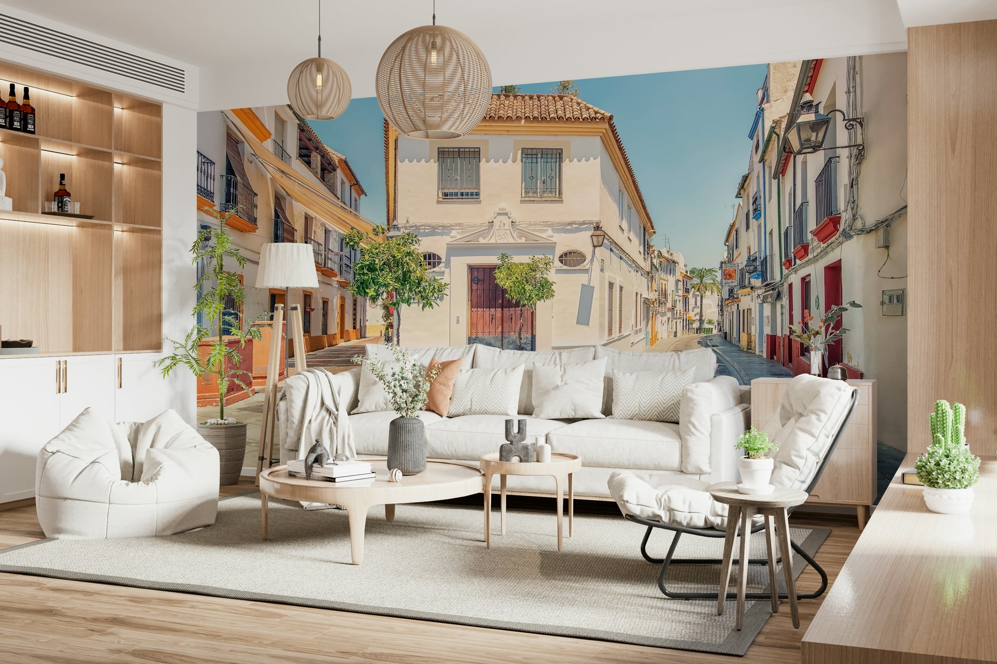 Bring the allure of a sun-drenched Spanish street into your home. This image showcases classic architecture bathed in warm, inviting light. Creamy whites and soft oranges create a soothing palette, while the cobblestone street adds texture. Consider this wallpaper for walls to infuse your living room, dining room, or hallway with a touch of old-world charm. The perspective draws the eye, making smaller spaces feel larger. The design complements both modern and traditional interiors, offering a versatile backdrop for your personal style.