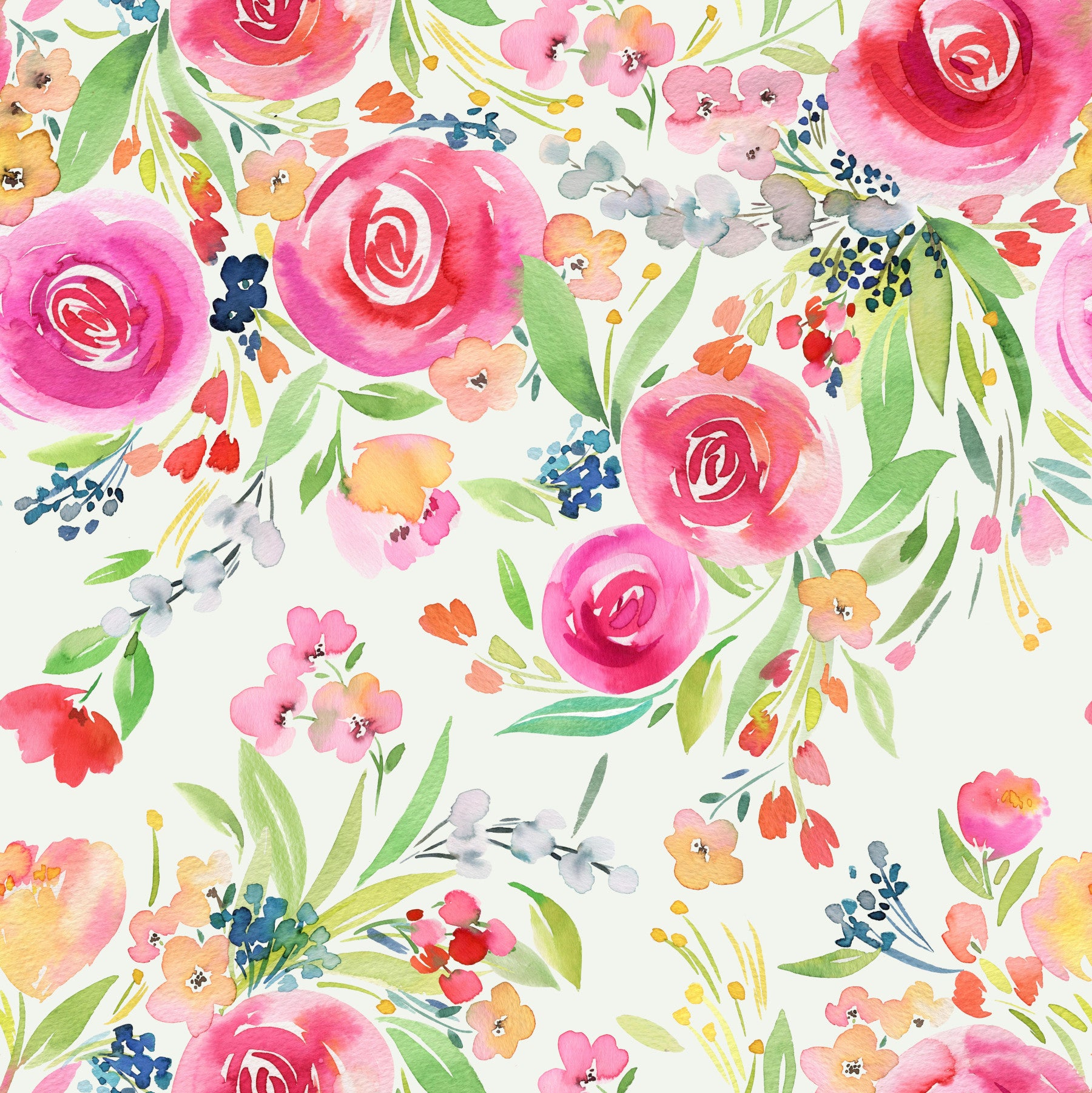 Immerse yourself in a breathtaking watercolor world with this wallpaper. Vibrant pink roses take center stage, their delicate petals rendered with expressive brushstrokes, showcasing a spectacular bloom. Surrounding these showstopping roses are an array of whimsical wildflowers in a delightful palette of peach, coral, and soft blues. The airy, light background allows the colors to pop, creating a cheerful and uplifting atmosphere. Perfect for adding a touch of romantic, whimsical nature to your digital space.