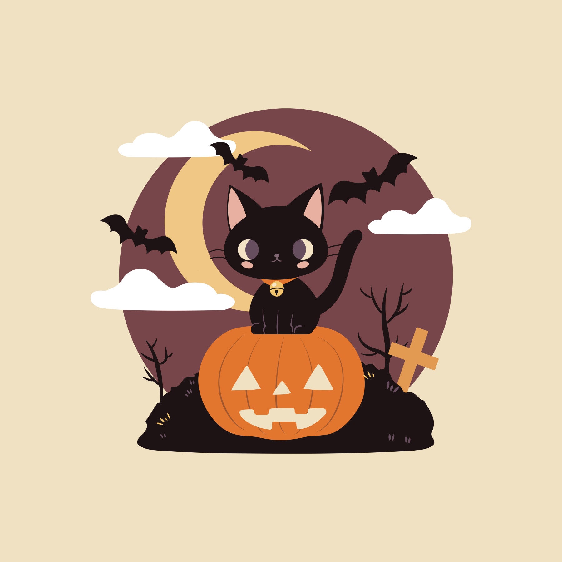 A black cat sitting on a pumpkin mural under a full moon with bats.