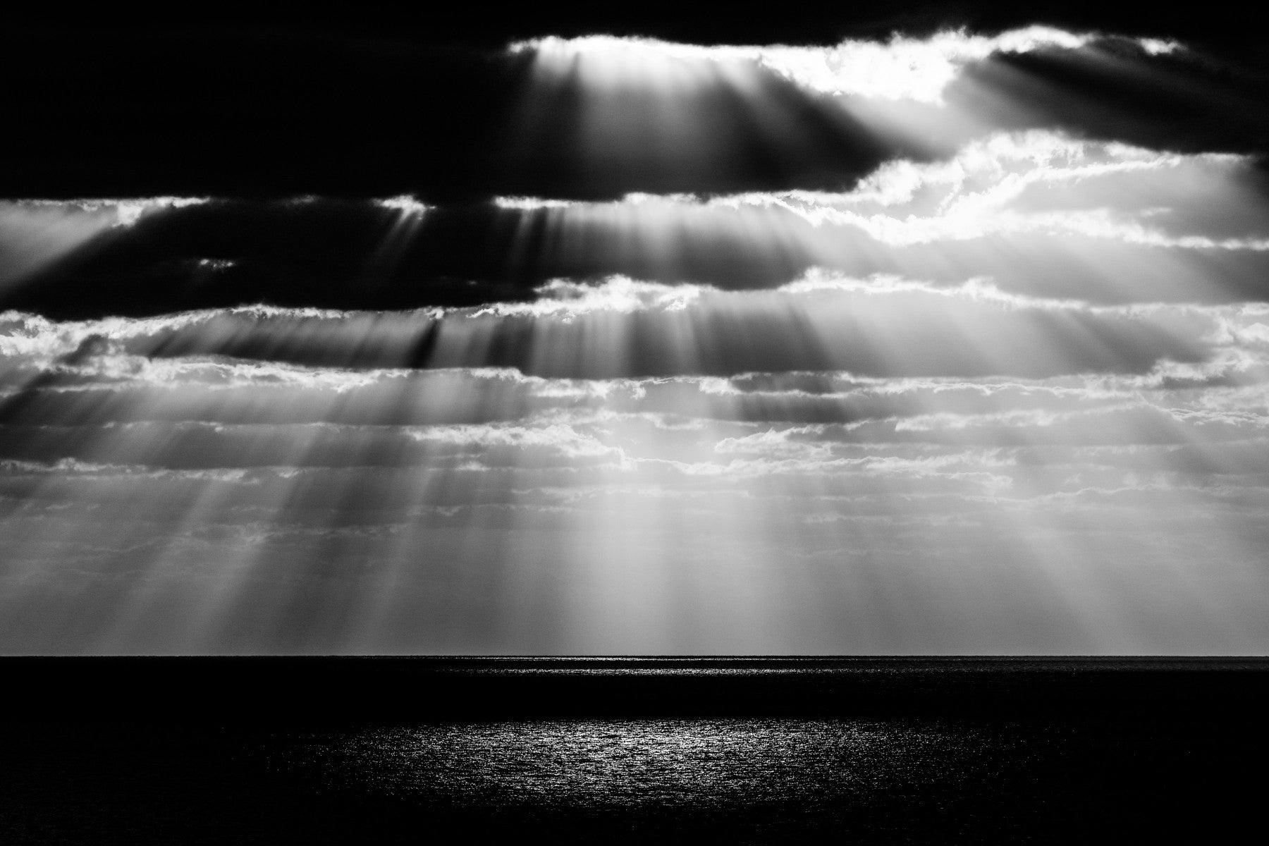 Bathed in monochrome splendor Spot captures a moment of profound beauty where light pierces through the veil of gathering clouds to kiss the vast expanse of the sea. This striking image features dramatic beams of sunlight, illuminating a single, shimmering 'spot' on the water's surface, creating a focal point of radiant energy. The stark contrast between the inky depths of the ocean and the luminous rays above evokes a sense of tranquility and awe. The dynamic interplay of light and shadow transforms the ordinary into the extraordinary, offering a captivating visual experience that is both calming and invigorating. Perfect for those who appreciate the power of nature and the art of light.