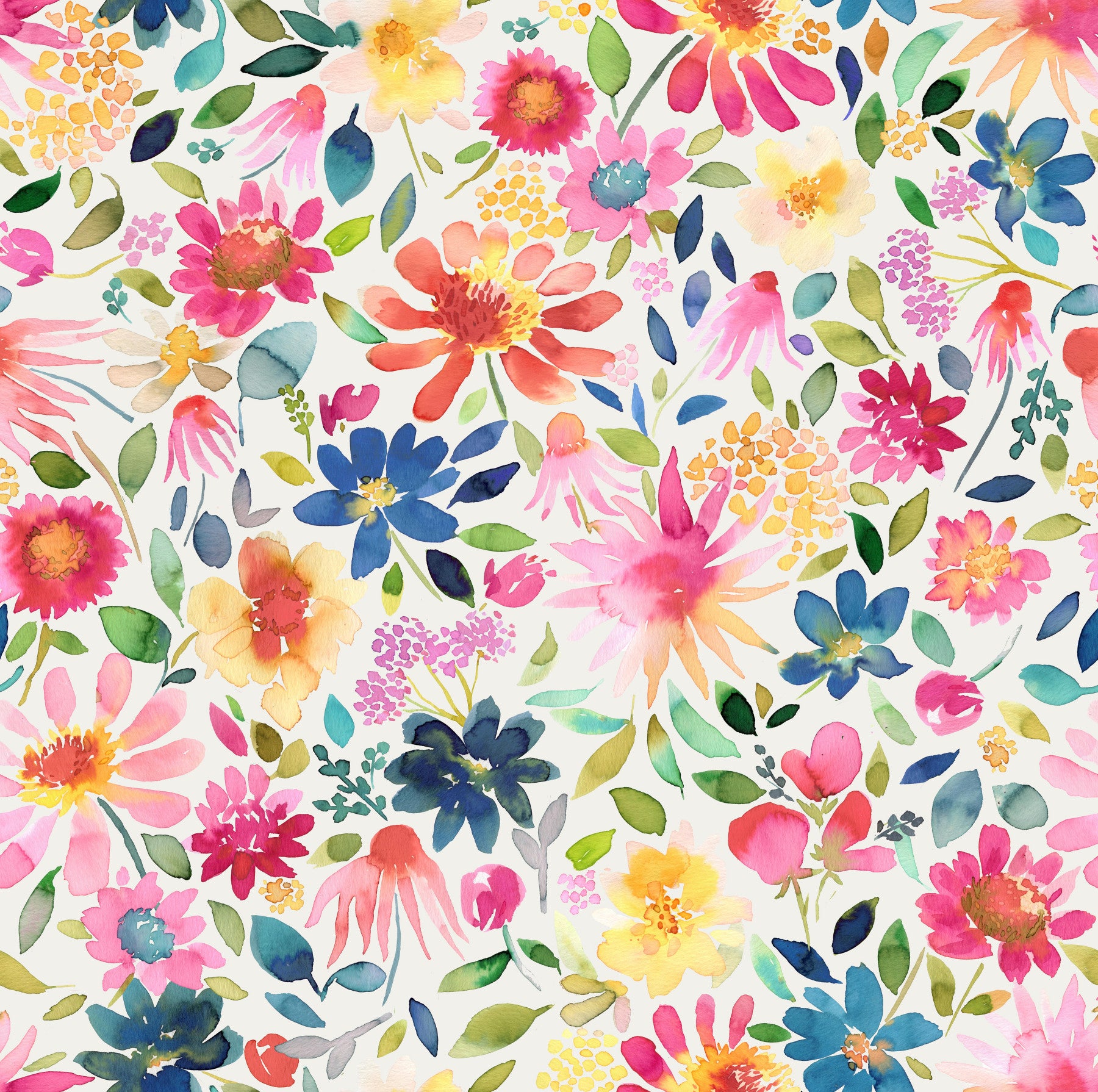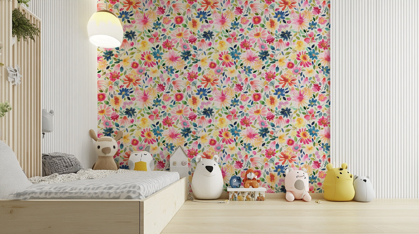 Embrace the vibrant energy of spring with this breathtaking wallpaper! A captivating array of watercolor zinnias, in hues of pink, coral, yellow, and blue, dance across a soft off-white background. Loose, expressive brushstrokes create a fresh, modern aesthetic, capturing the feeling of a flourishing garden bursting with life. Delicate leaves and smaller floral accents add depth and texture, making this a cheerful and uplifting design perfect for any room seeking a touch of natural beauty and springtime charm. The loose, painterly style lends a sense of joyful spontaneity, ideal for those who appreciate art that feels both vibrant and serene.