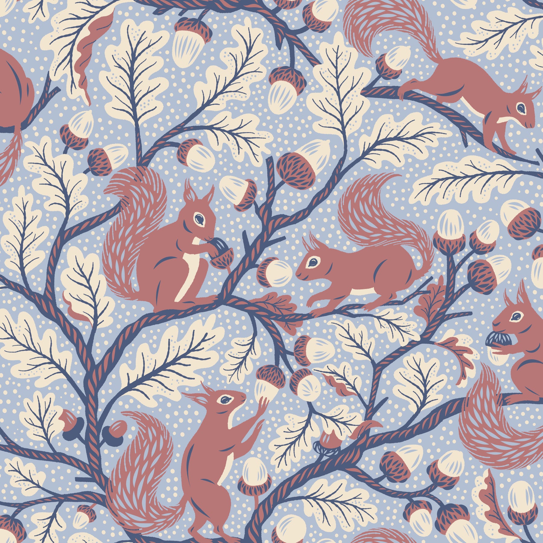 Hand-drawn squirrels and oak trees in blue hues