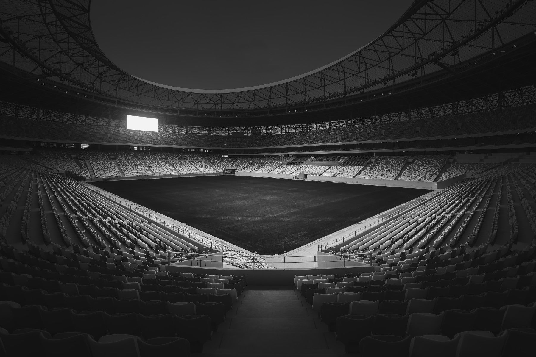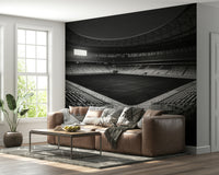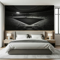 Transform your space with this captivating black and white stadium image. The monochrome palette accentuates the architecture and vastness of the arena, offering a modern and minimalist feel. The graphic nature works well in a study, home office, or even a teen's room. This wallpaper for walls will bring an urban, sophisticated element into any interior. The structured design lends itself to simple and modern furniture choices.