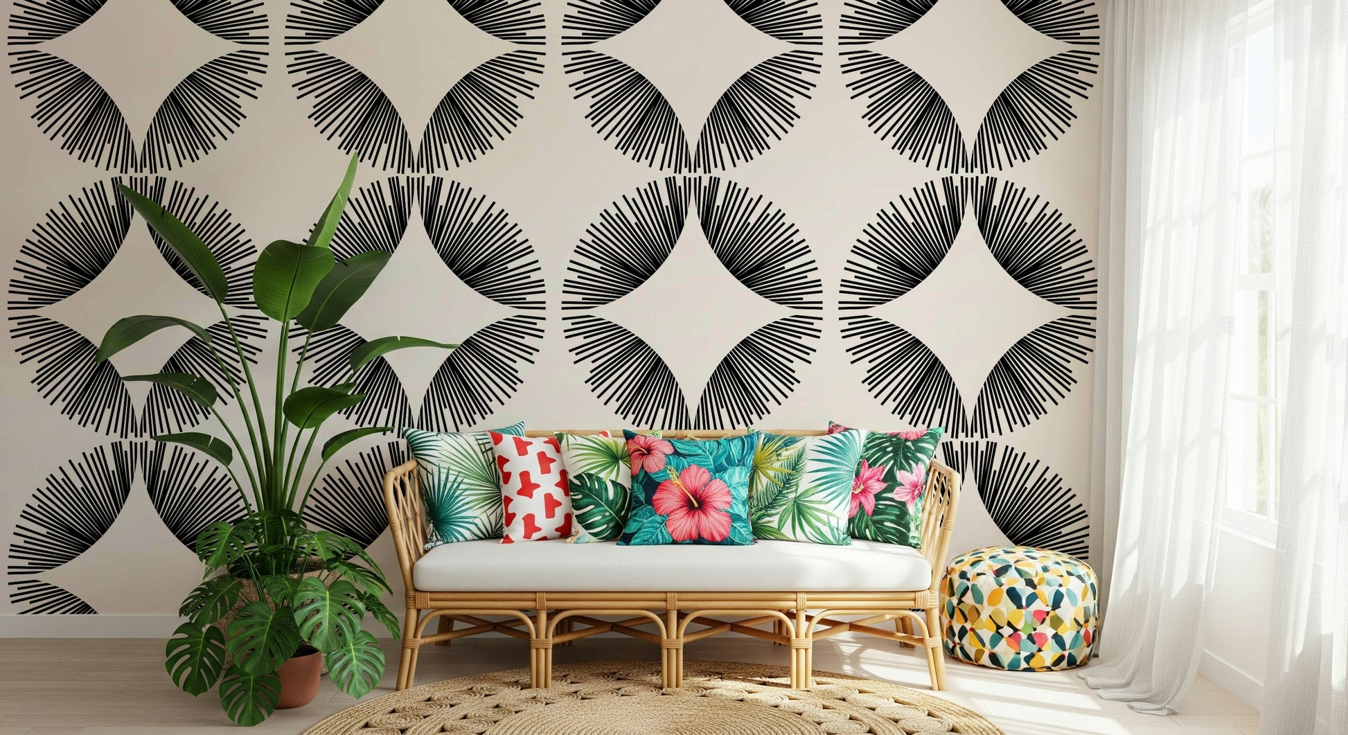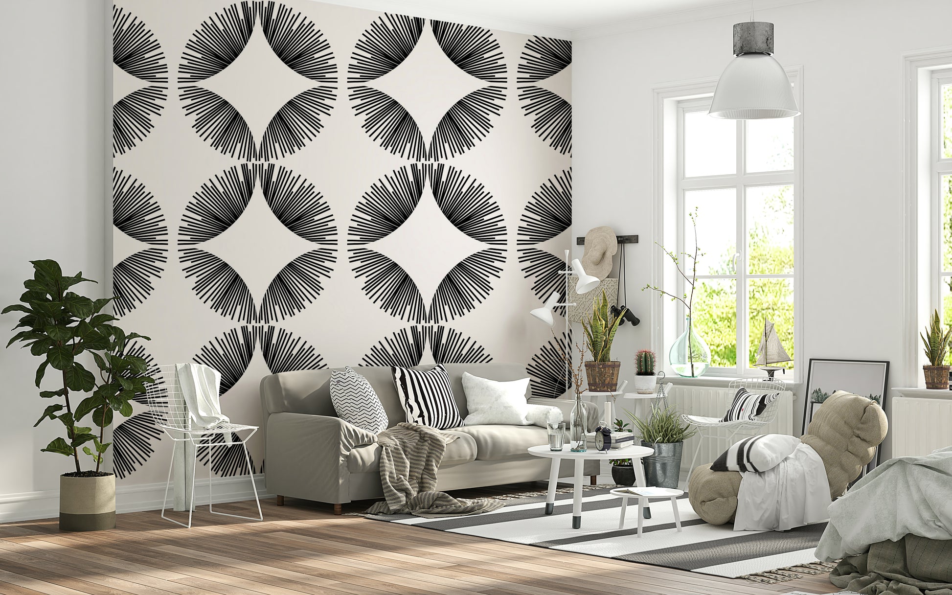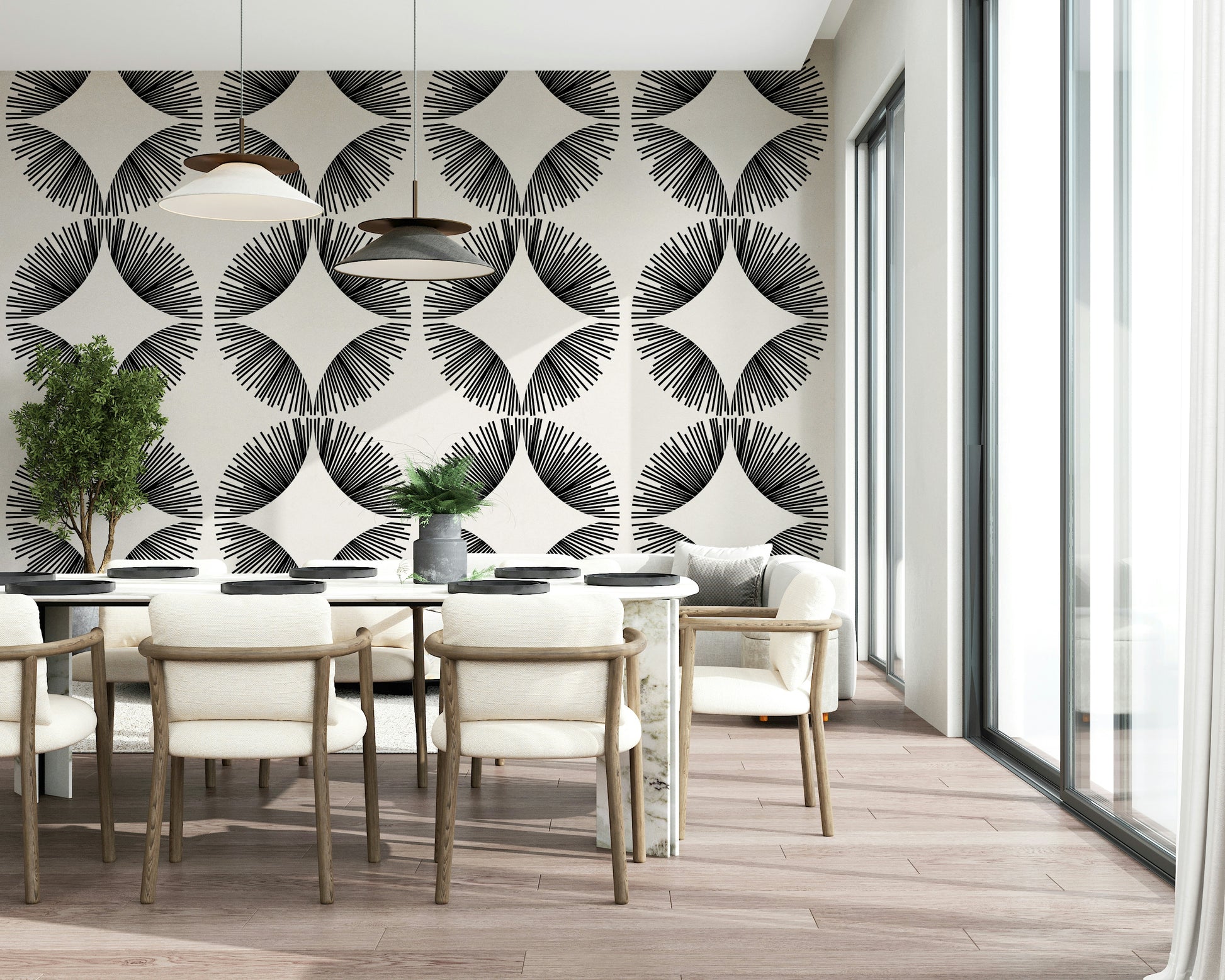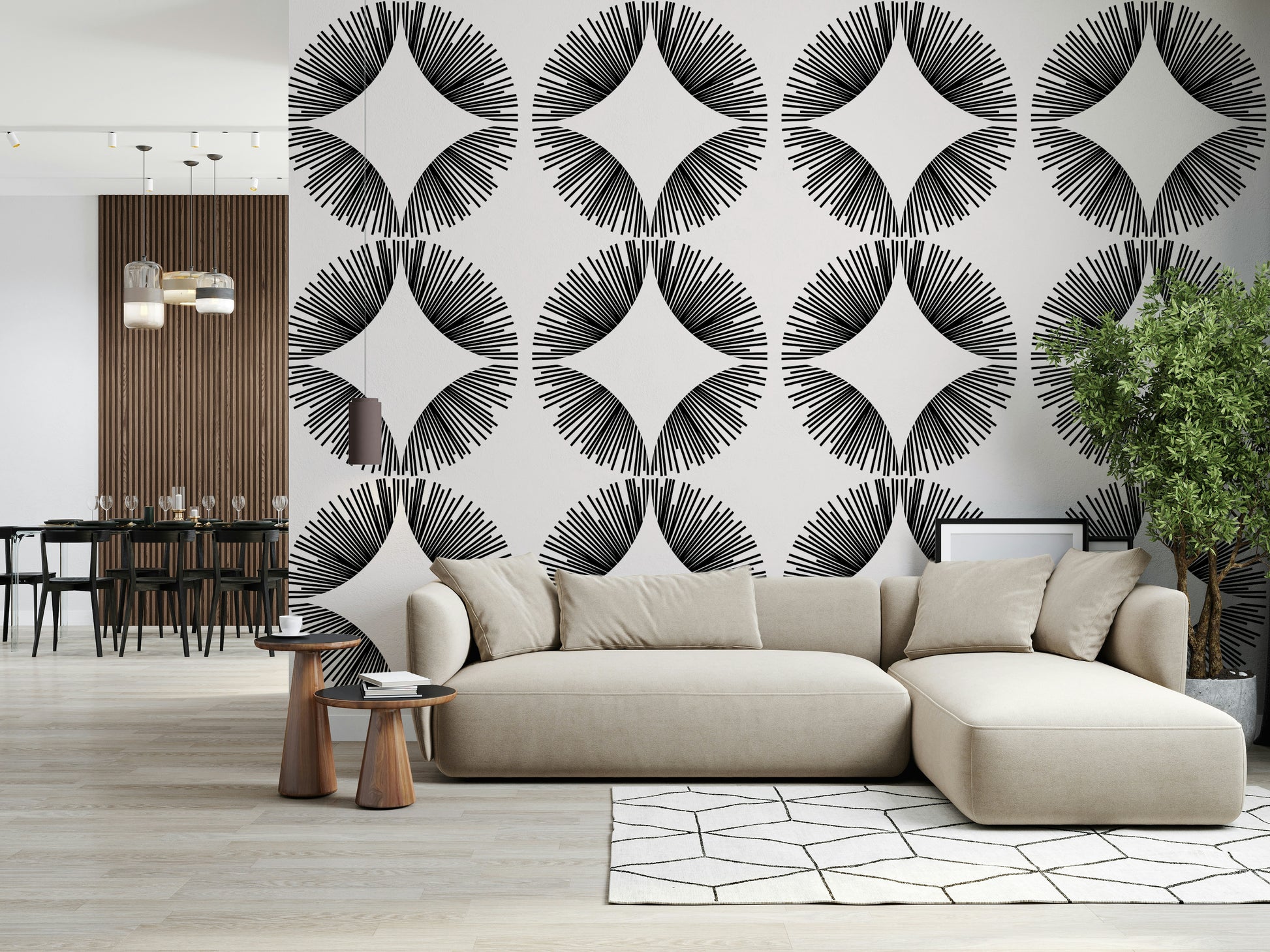 Infuse your home with the chic simplicity of this starburst-inspired wallpaper for walls. Black geometric lines pop against a light background. The design evokes a sense of radiating energy. The monochrome palette provides a versatile backdrop, making it a great addition to various interior styles. Install it in living spaces for a touch of understated flair, or in bedrooms for a modern vibe. This pattern shines in home offices or entryways, especially spaces that call for a clean aesthetic. Introduce this classic yet modern look to elevate spaces with clean lines and bold visual impact.
