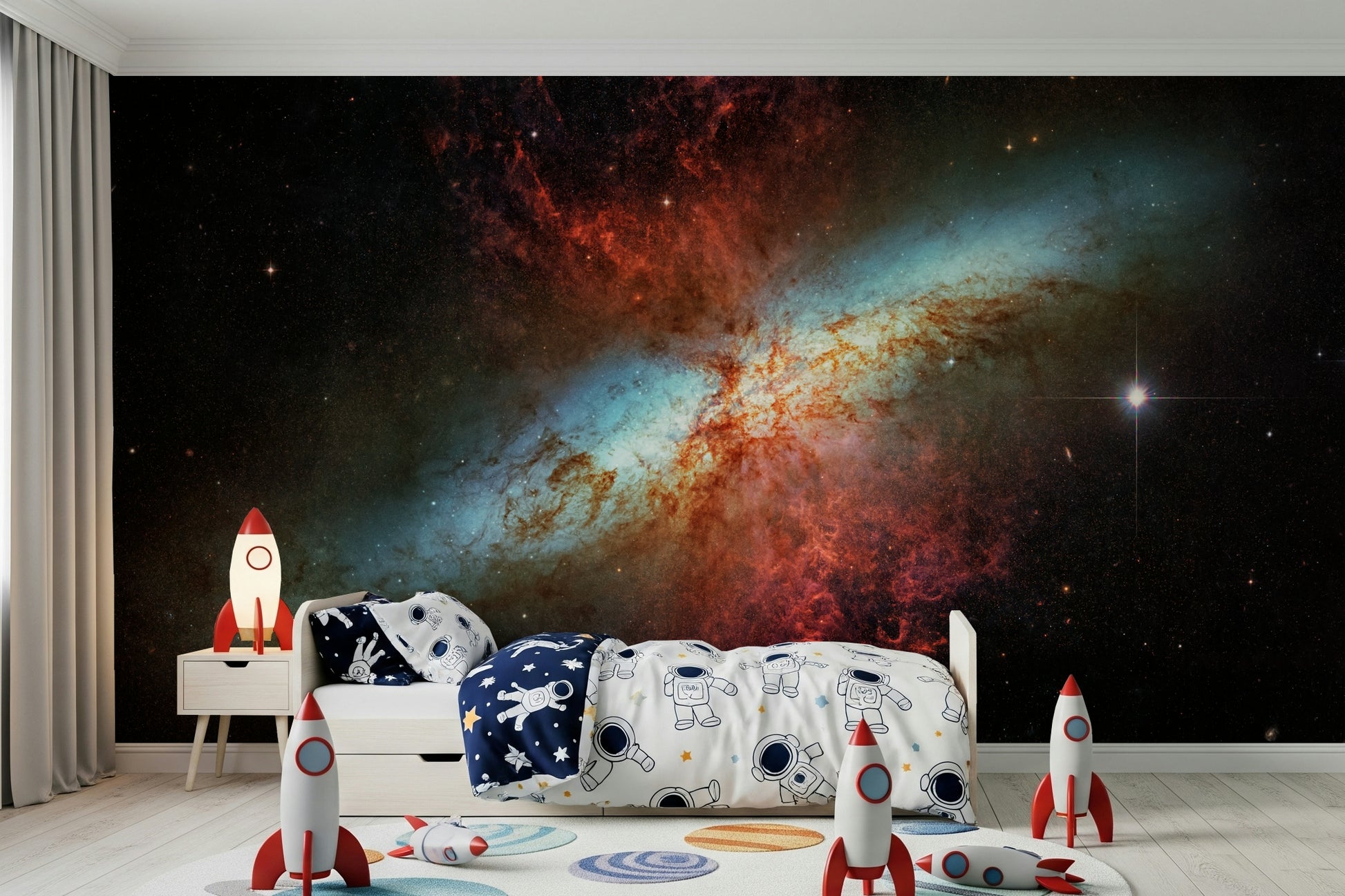 Infuse wonder into your interior with this spectacular stardust design. This wallpaper for walls captures the ethereal beauty of a distant galaxy, blending shades of crimson and azure with the infinite sparkle of faraway stars. Perfect for a sophisticated study, a tranquil bedroom, or an expansive living area, it creates an atmosphere of cosmic elegance. The rich, deep colours enhance the mood, providing a sense of depth and tranquility. Elevate your space into a personal observatory with this unique design that celebrates the grandeur of the universe.