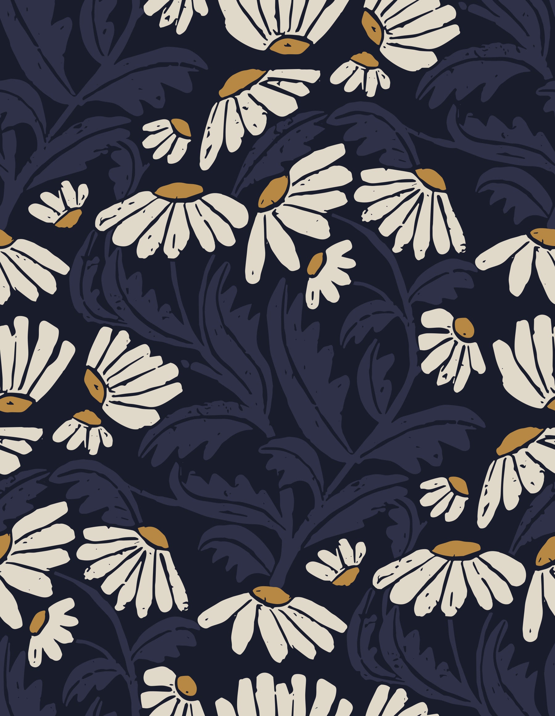 'Starlight Daisies' offers a dreamy escape with its enchanting floral design. The deep navy background evokes a night sky, while the stylized daisies, in soft cream and warm gold, resemble stars scattered across the canvas. The slightly textured appearance of the hand-drawn style adds visual richness and depth. This wallpaper brings a sense of peace and quiet elegance to any space, perfect for bedrooms, living rooms, or hallways. Its repeating pattern creates a soothing visual rhythm, inviting relaxation and tranquility.