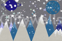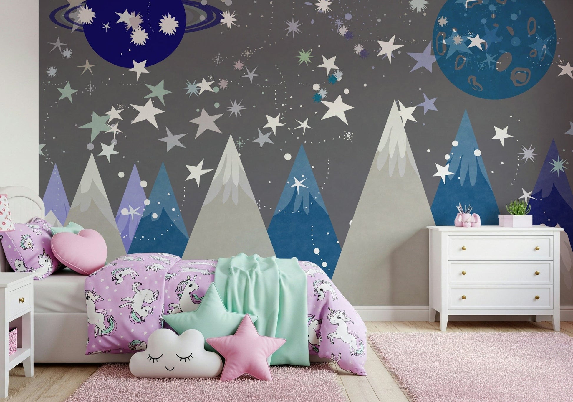 Transform your space with this whimsical wallpaper for walls featuring a celestial mountainscape. Planets and stars float above stylised mountain peaks in a cool palette of blues, greys, and whites. The geometric design provides a modern touch. It is perfect for a kid's room, nursery, or any space craving a playful yet calming ambience. The muted colours bring a peaceful mood while brightening up spaces.