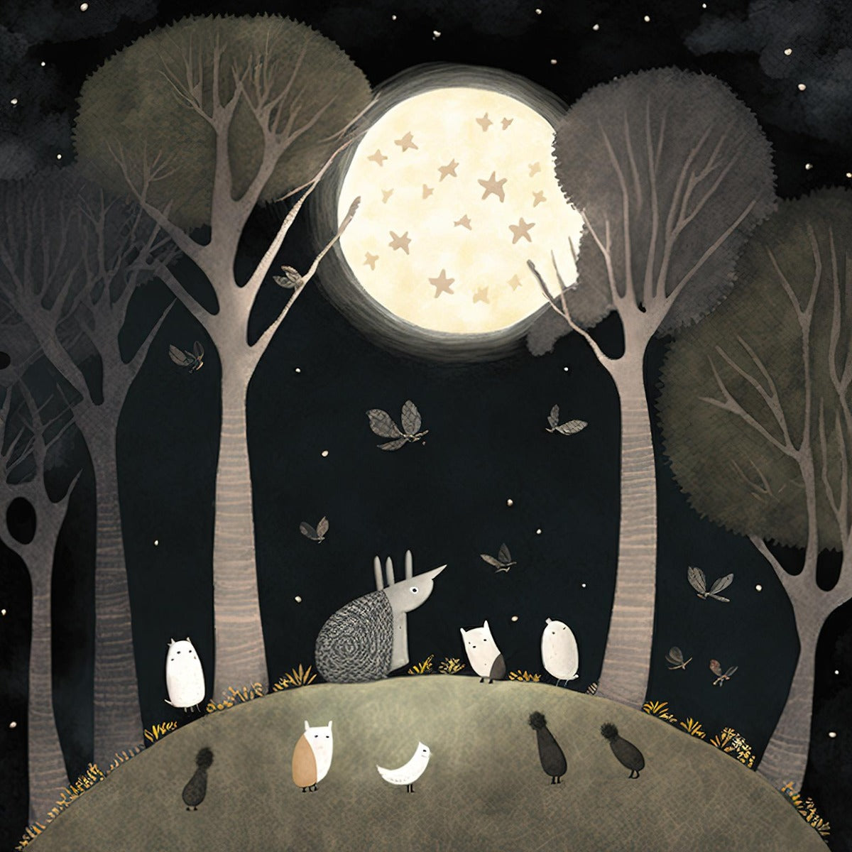 Moonlit starry night wallpaper featuring cute animal friends