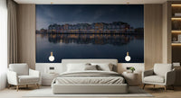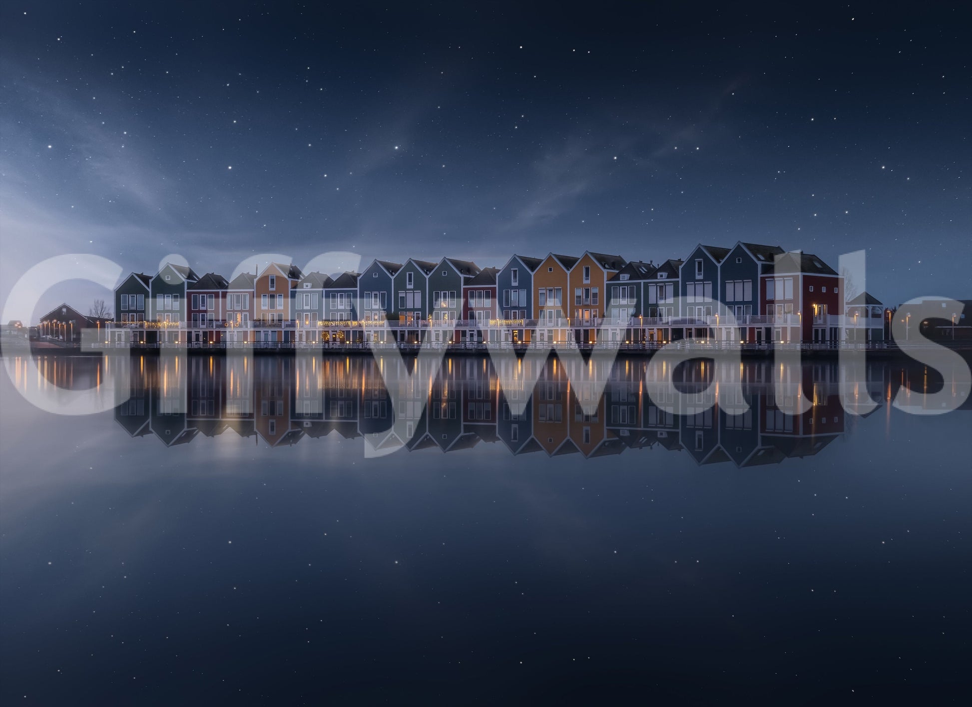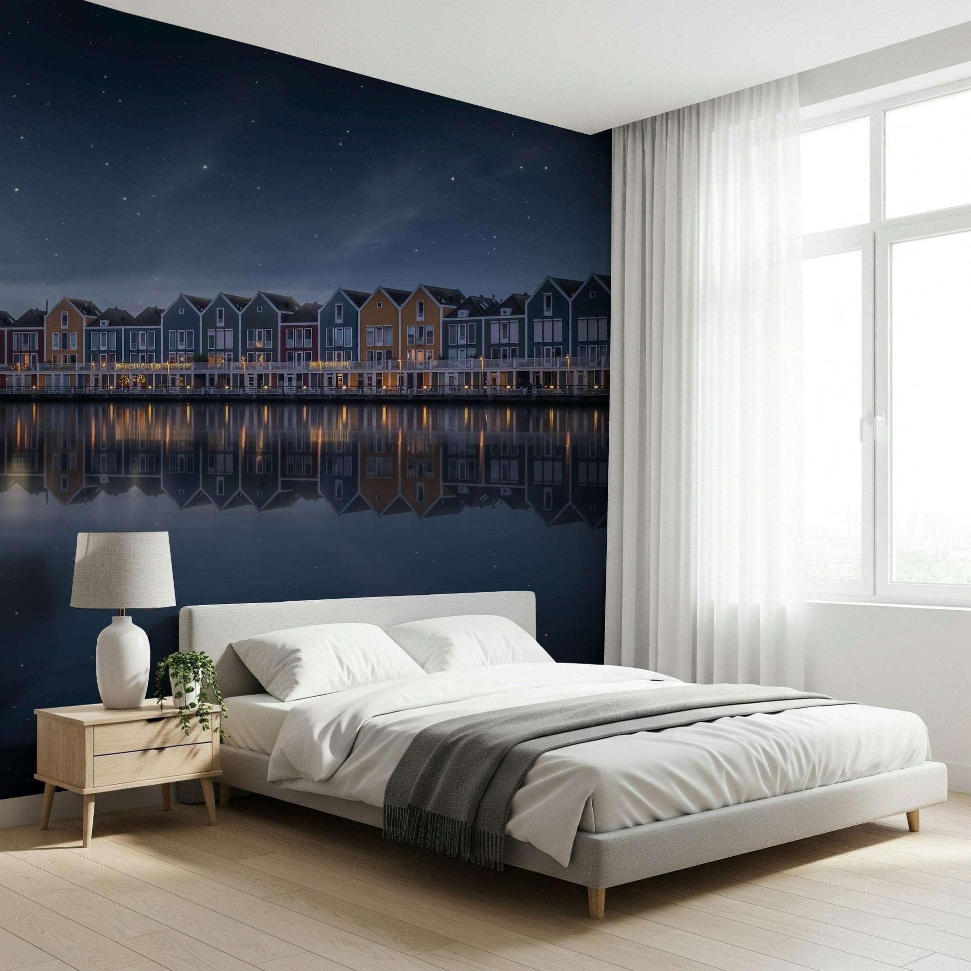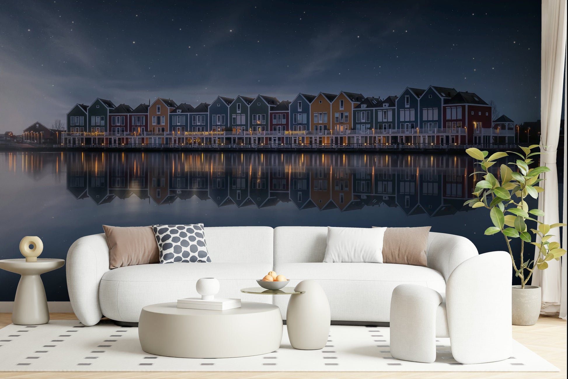 Observe the tranquillity of a serene night. This image displays colourful houses reflected in calm waters beneath a starry sky. Gentle hues of blue, green, red, and orange create a peaceful scene. This wallpaper for walls works excellently in a bedroom or living room. The reflections and star-filled sky introduce a sense of calm and depth. It creates an inviting atmosphere and also suits a hallway or office, adding a touch of sophisticated charm to any interior.