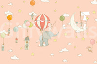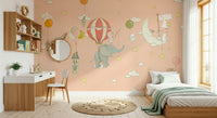 Invite wonder into any room with this charming wallpaper. It pictures an adorable elephant under a hot air balloon, houses floating through the sky, and cute animals sailing on a moon. Soft pastel colours create a peaceful mood. This delightful design is excellent for bedrooms, nurseries, or playrooms. It promotes creativity and comfort. Transform your interiors with this wallpaper for walls. The soft hues and engaging scene make any room feel cosy and inviting.