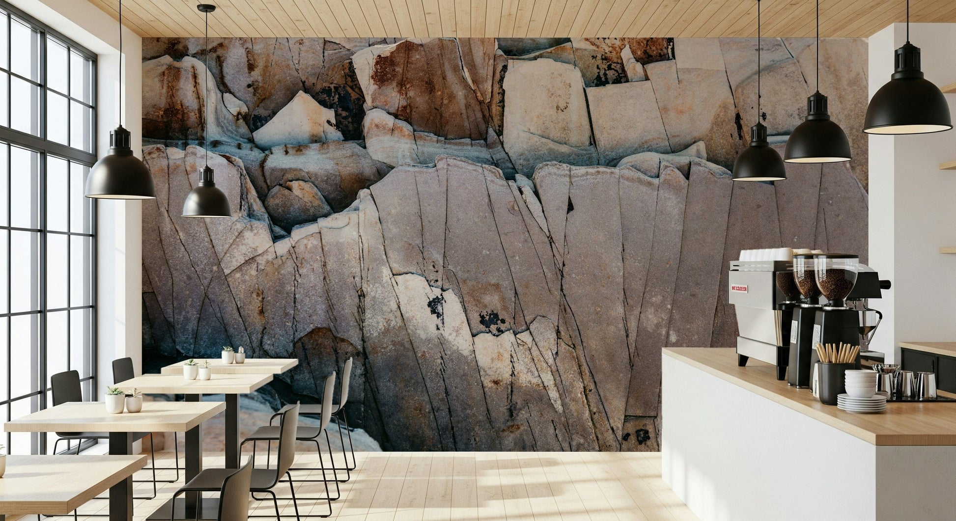 This rock-inspired wallpaper presents an exploration of geometry in nature. The design emphasises sharp lines and varied shapes with its rock formations. Earthy tones provide a grounded feel, perfect for a modern living room or home office. Choose this wallpaper for walls to bring an element of the outdoors inside. It offers a seamless blend of organic design and sophisticated styling.