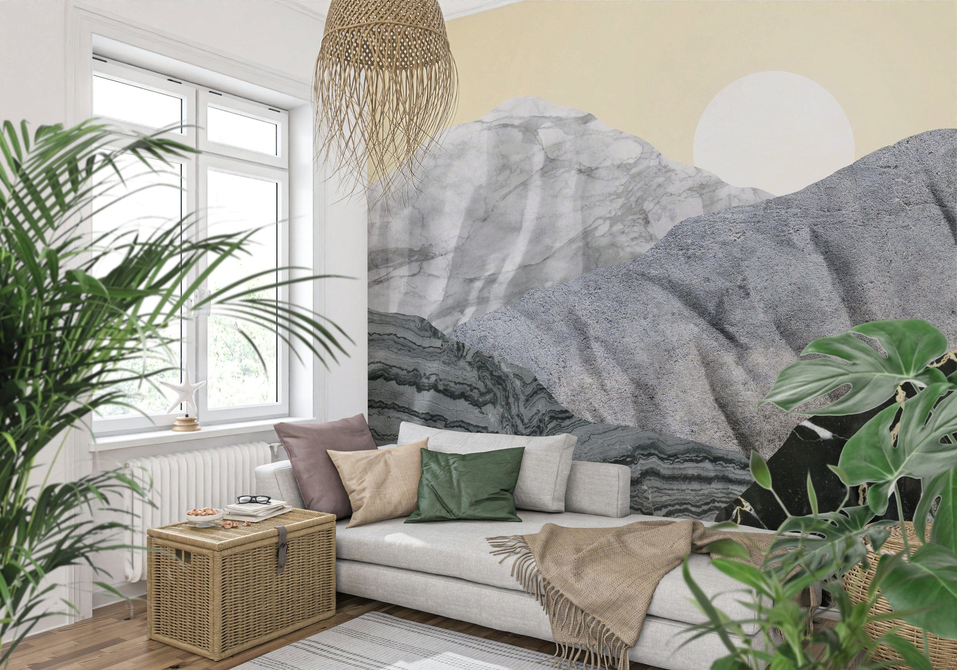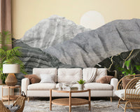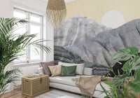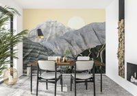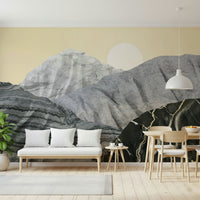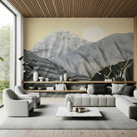 Transform your space with Stony Peaks, a stunning landscape portrayal. Mineral-like formations rise against a pale yellow sky. A crisp sun completes this unique scene. The design utilises varied textures. Colours range from light grey to black, creating depth. Consider this wallpaper for walls for your living room, study, or dining area. It provides a contemporary, artistic focal point. It complements clean lines and natural materials.
