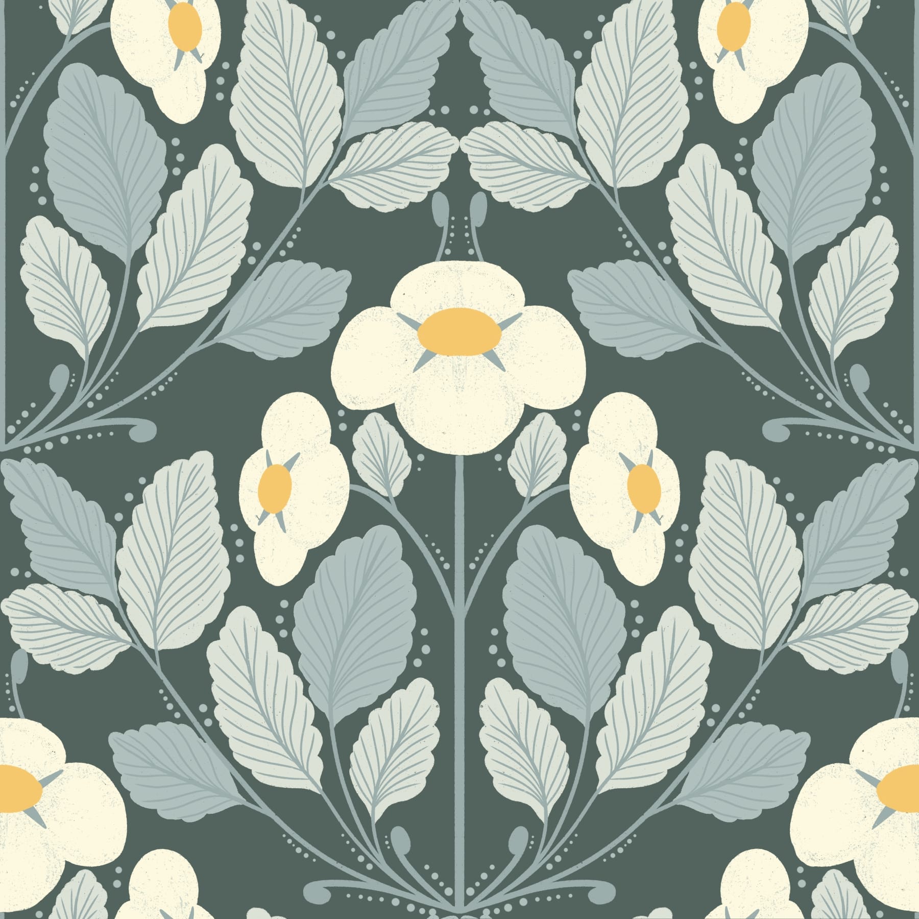 Whimsical folk wallpaper with deep green night palette