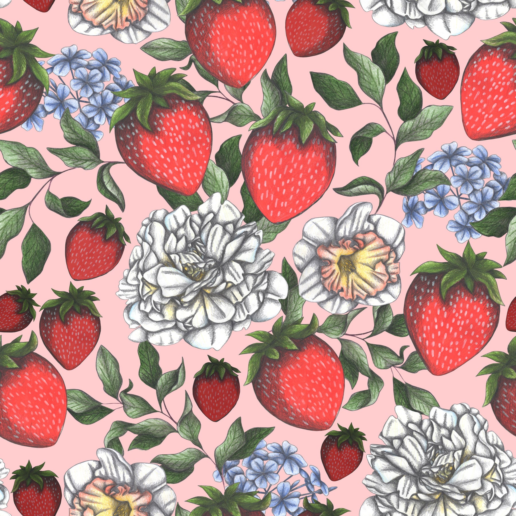 Our Strawberry Season Wallpaper celebrates the delightful charm of summer. This vibrant mural wallpaper showcases juicy red strawberries alongside delicate white and blue blossoms and fresh green leaves, all on a lovely pink background. It's the perfect wallpaper for walls to give your room a cheerful and inviting look, making every day feel like a bright summer morning.