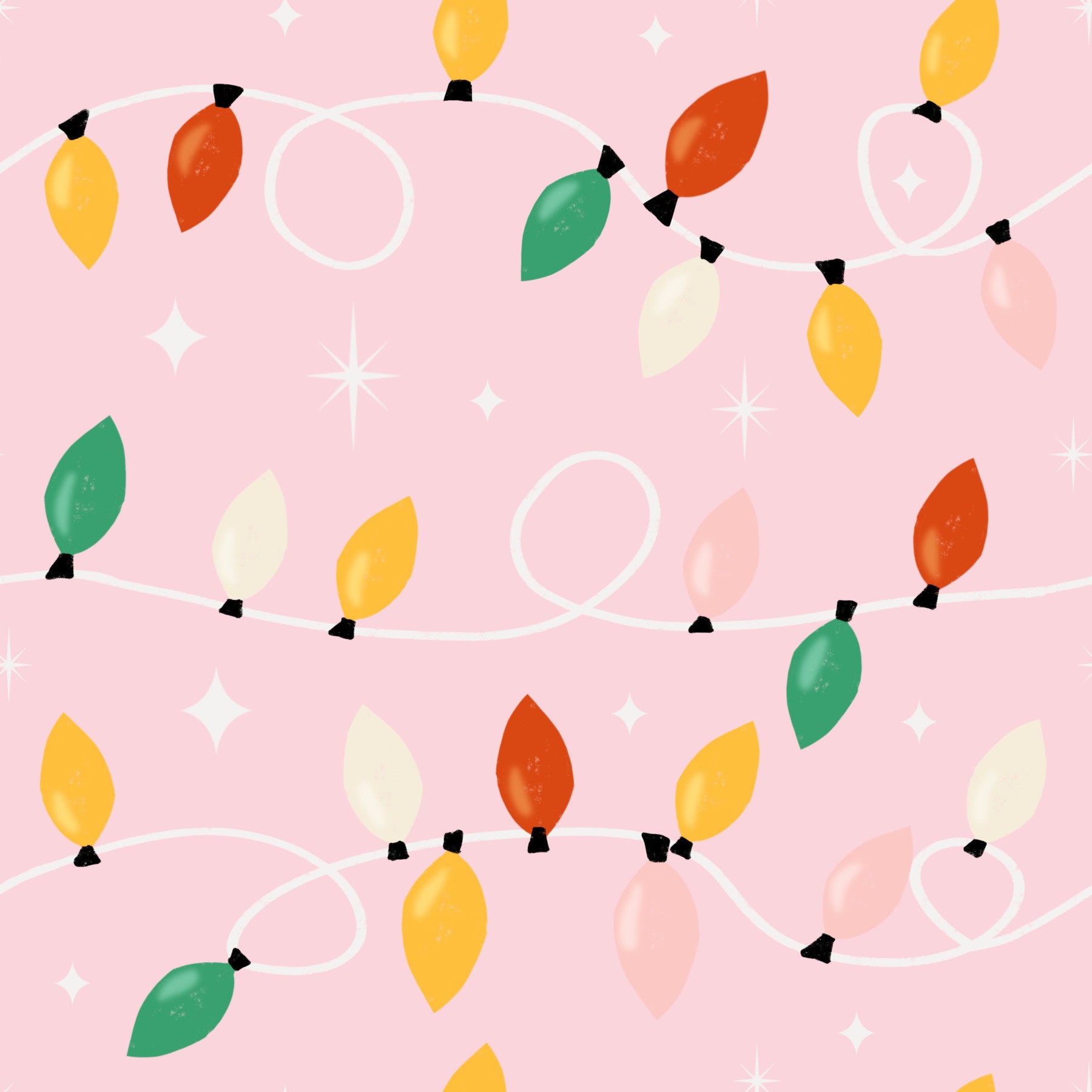 A cute and festive wallpaper pattern of colorful light bulbs and tiny stars across a pink background.
