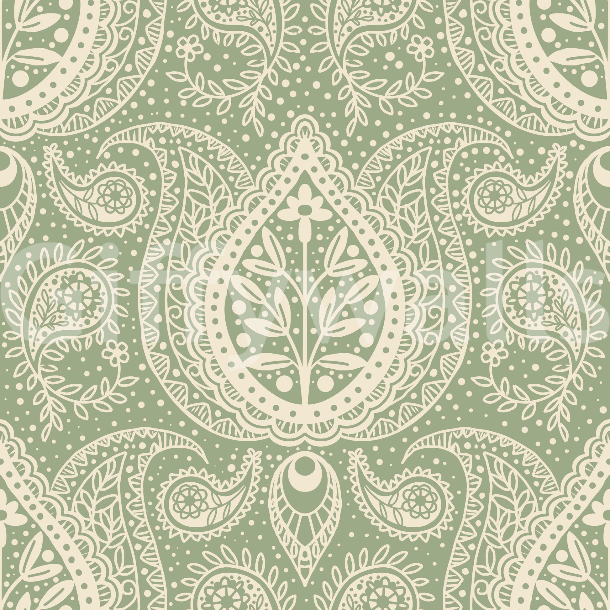 Indulge in the serene beauty of "Subtil Botanical Paisley - Sage Green." This wallpaper showcases a delicate dance of off-white paisley patterns on a calming sage green backdrop. Intricate floral details and subtly textured leaves intertwine, creating a sophisticated yet organic feel. The design is both calming and visually engaging, perfect for adding a touch of understated elegance to any digital space. The soft color palette promotes relaxation, while the detailed patterns offer a captivating visual journey. Transform your screen into a tranquil oasis with this refined botanical masterpiece.