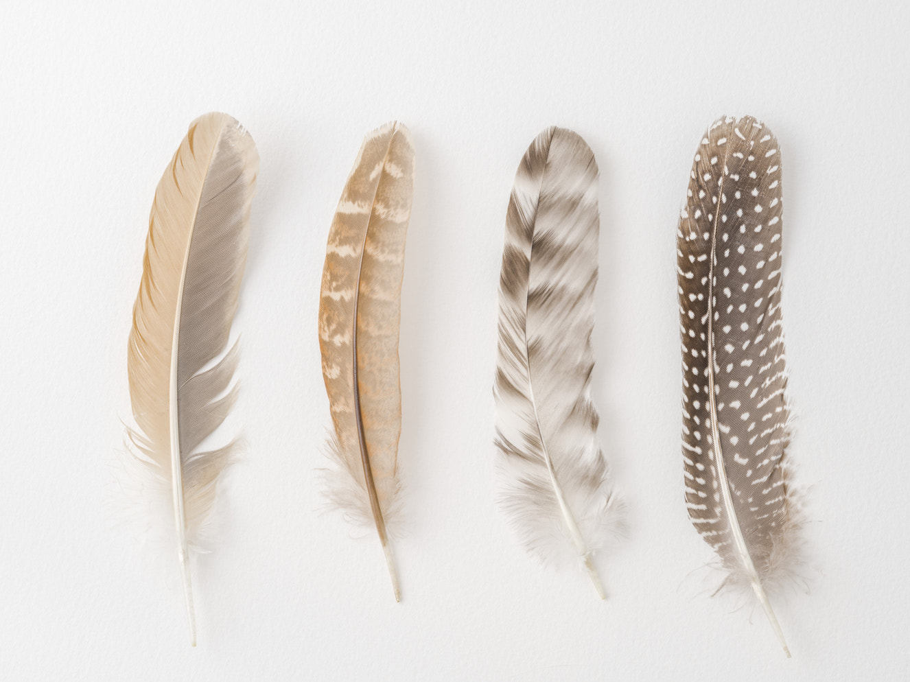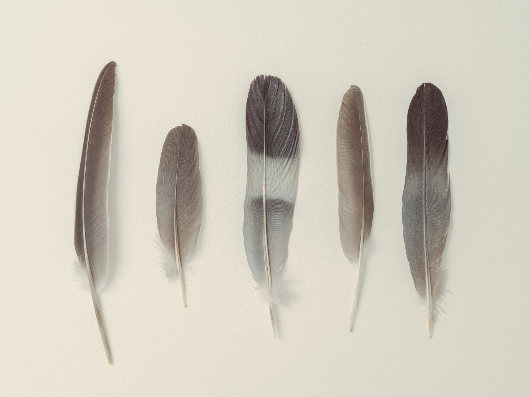 The image shows five feathers of varying sizes.