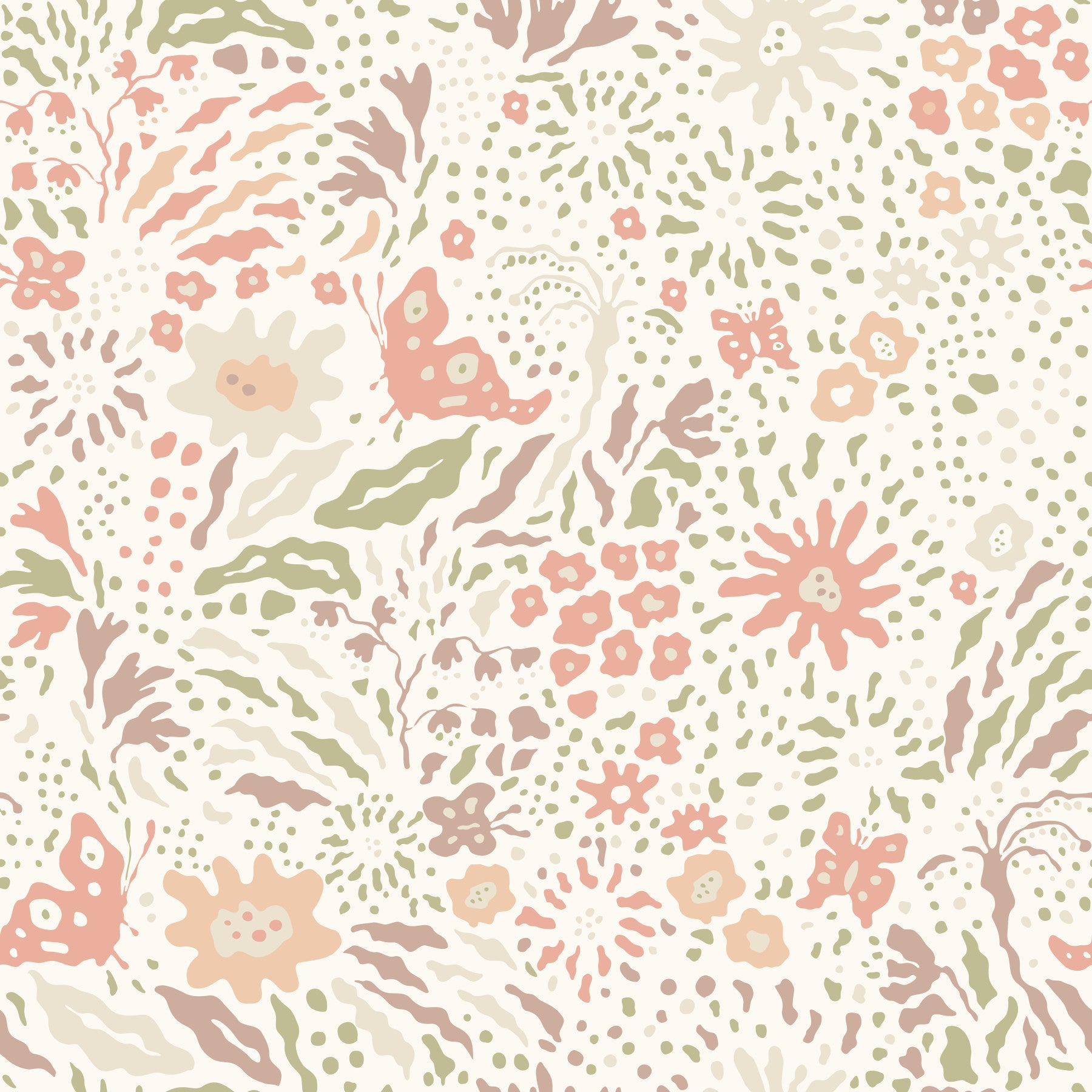 Transform your space into a serene retreat with this charming floral pattern. Gentle blossoms and whimsical butterflies dance across a soft ivory backdrop. This wallpaper for walls features a delightful array of botanicals, designed in muted tones of peach, sage, and beige. The subtle palette and organic shapes offer a touch of sophistication to bedrooms, living areas, or nurseries. Its versatility easily works with various interior themes, creating a calm, inviting space.