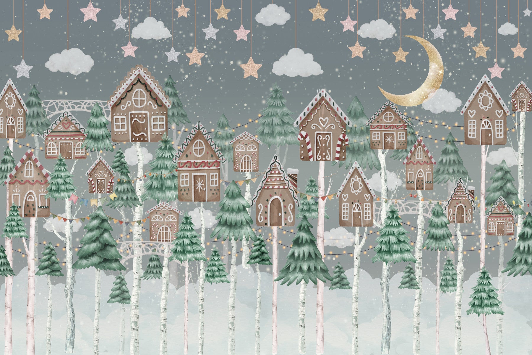 Transform your room into a magical winter village with this delightful wallpaper for walls. The image presents a whimsical scene of gingerbread houses amongst frosted birch trees, beneath a star-studded sky. Soft pastel colours and intricate details create a serene, dreamlike ambience. Ideal for a kids room or a bedroom, this design adds a touch of joy to any interior. It works wonders with a soft, light style and brings charm to your home.