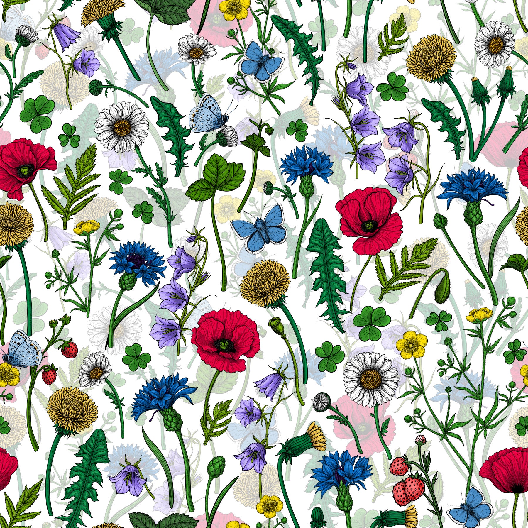 Escape to a sun-dappled meadow with this dreamy wallpaper. The design is a celebration of summer's bounty, featuring a delightful array of hand-drawn wildflowers, including vibrant poppies, delicate daisies, and charming cornflowers. The inclusion of playful butterflies adds a lighthearted and whimsical element to the scene. The meticulous detailing and rich color palette create a sense of tranquility and natural beauty, perfect for transforming any space into a serene haven. It’s a sophisticated yet playful design, ideal for bedrooms, nurseries, or living spaces.
